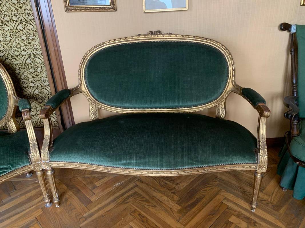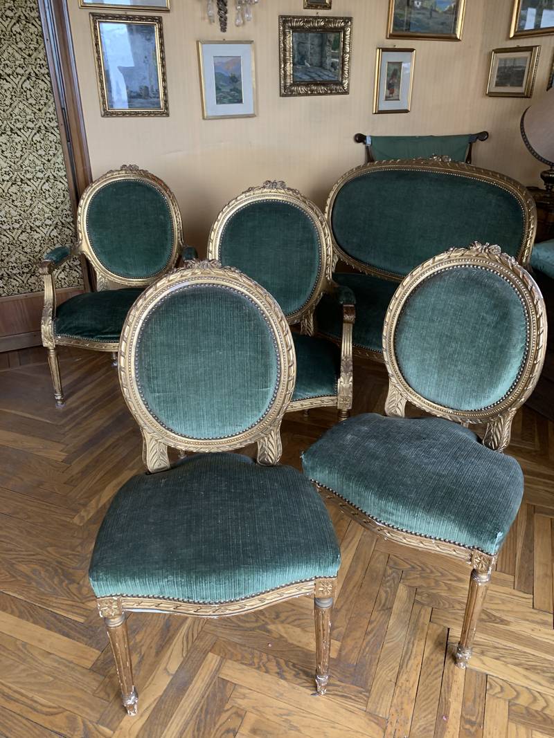Antico salotto dorato Epoca XIX secolo divano con due poltrone e due sedie Stile Luigi XVI