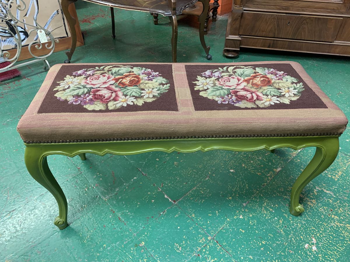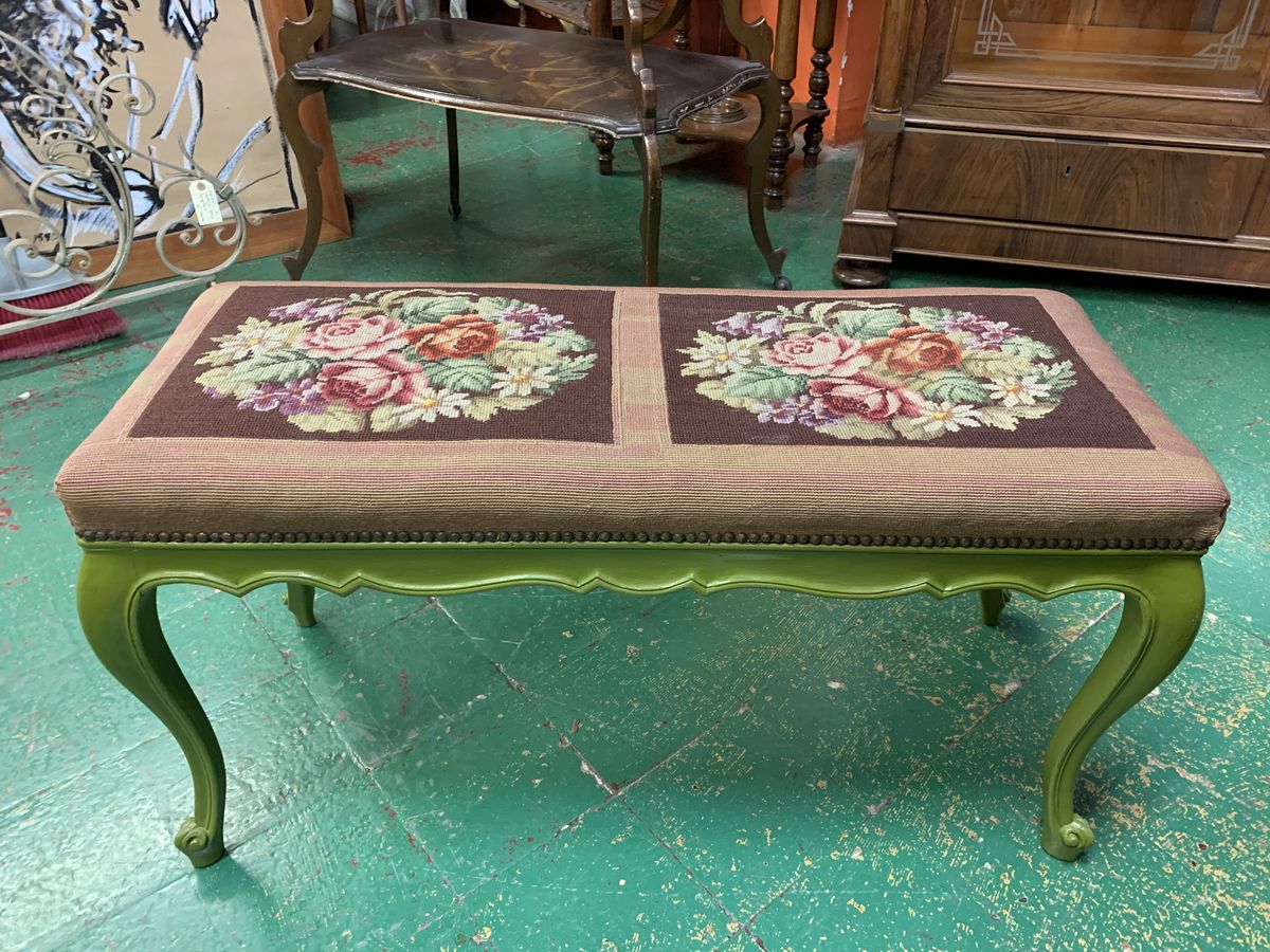 Panchetta in legno lacca verde imbottita piedi a ricciolo imbottita con tessuto con antico ricamo d’epoca