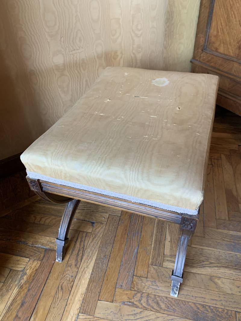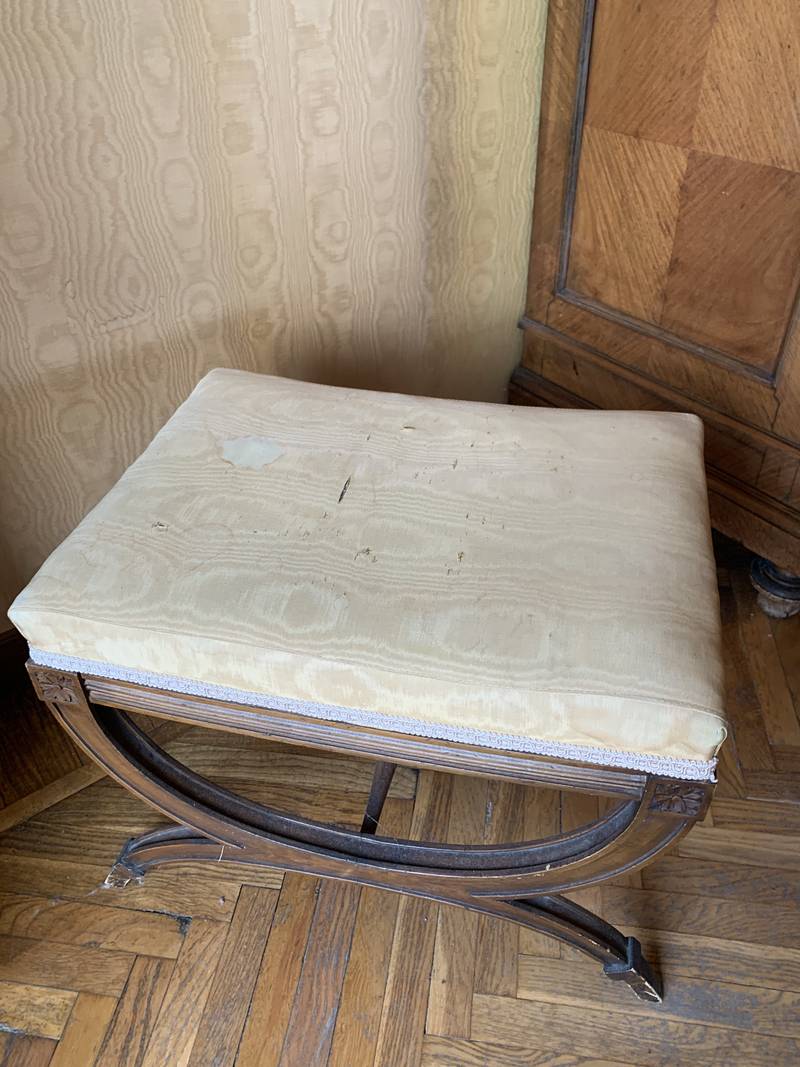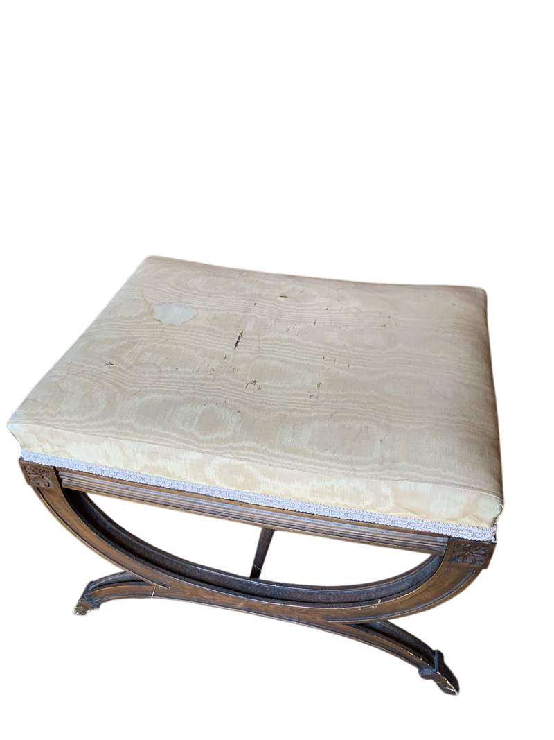 gambe a forbice seduta imbottita in moire’ giallo che pero’ è macchiato e andrebbe sostituito