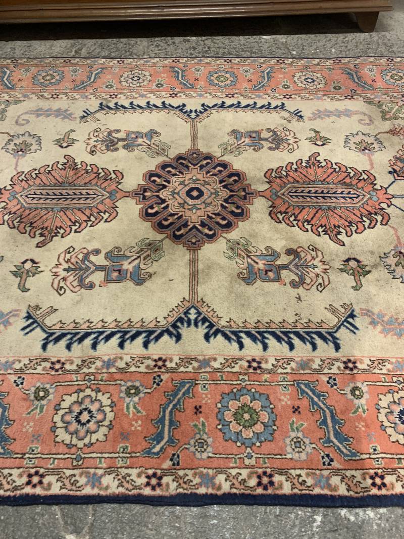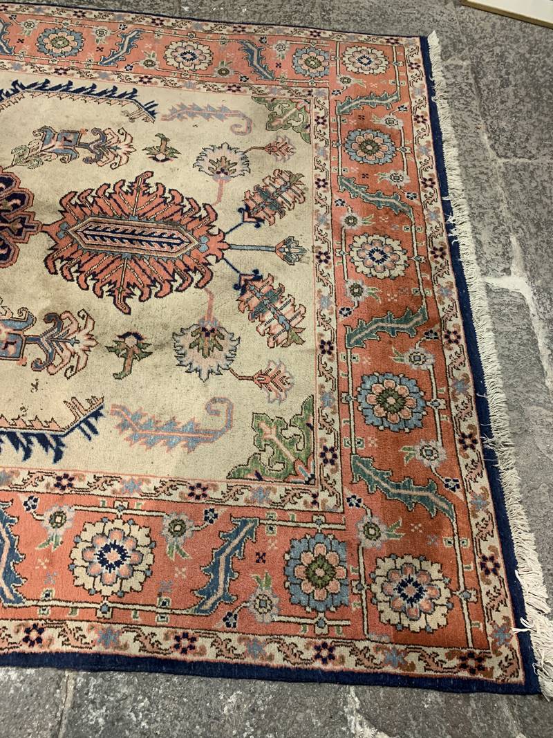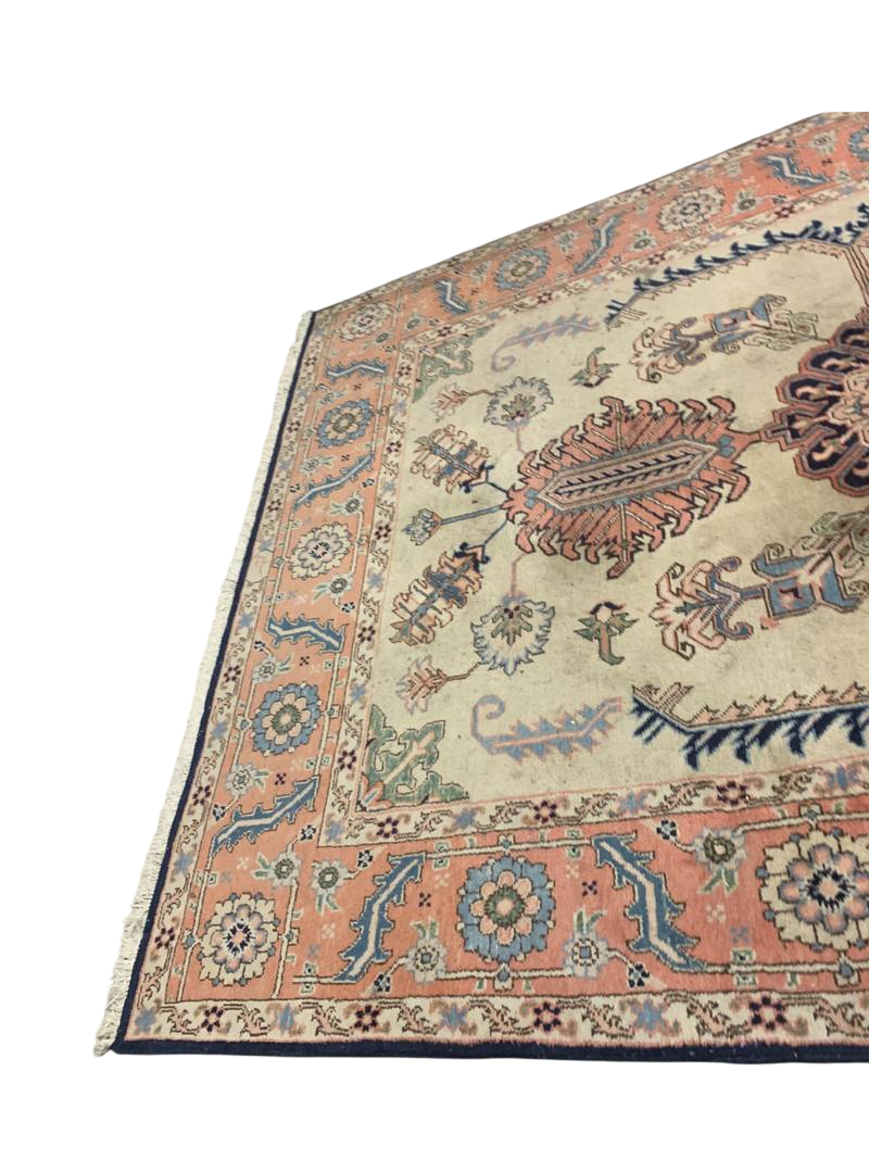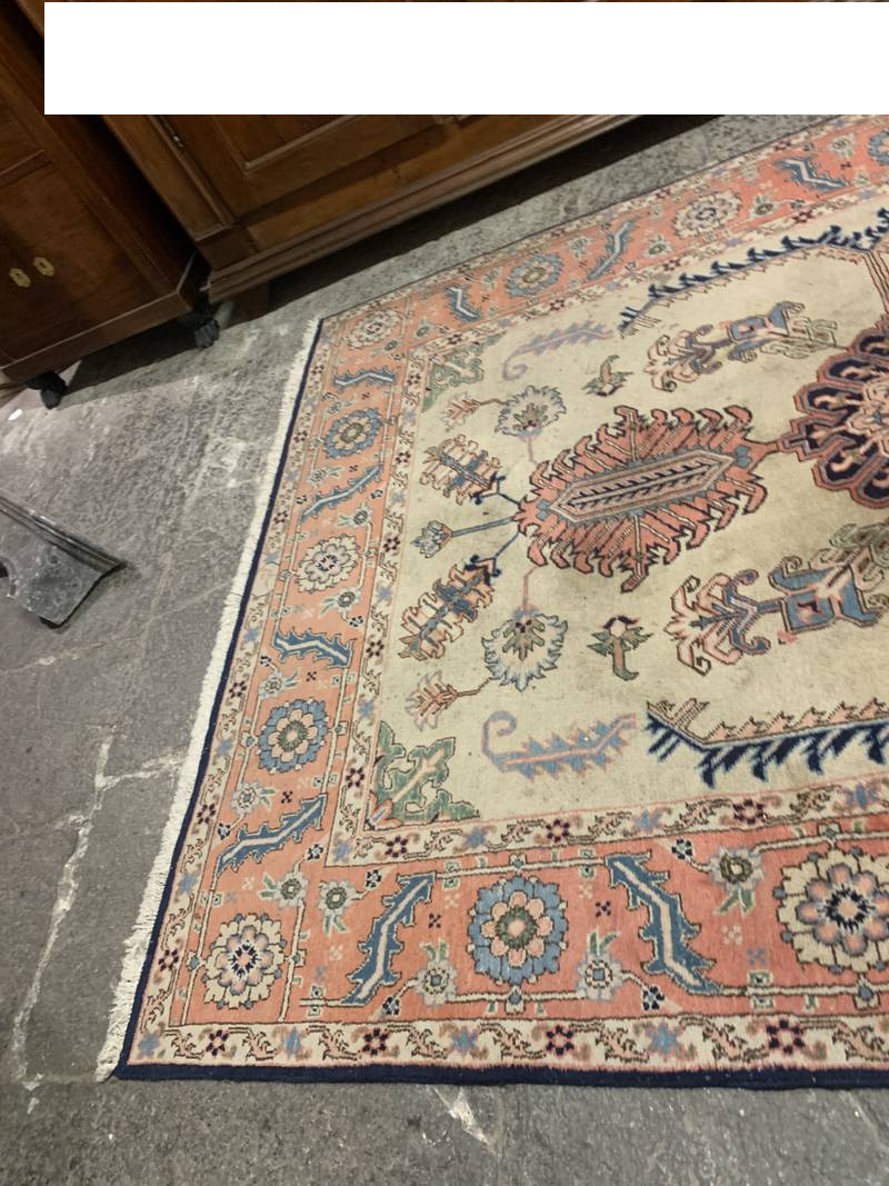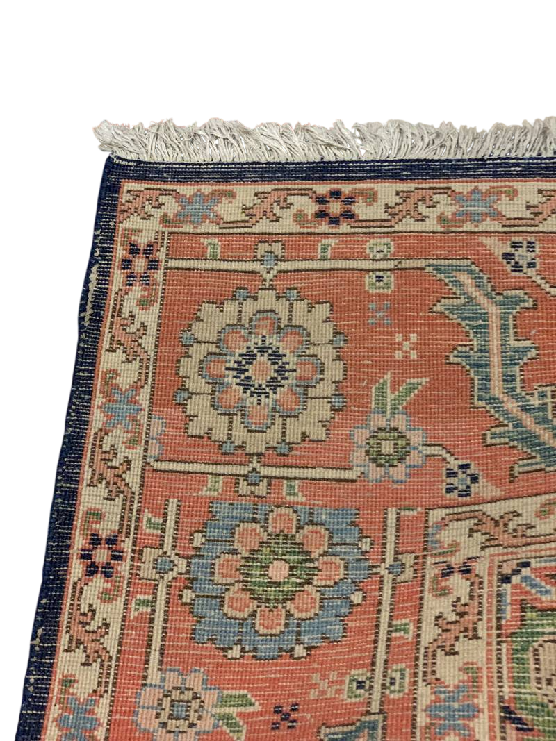 Antico grande tappeto persiano tappeto con un motivo floreale a medaglione centrale e colori pesca e blu.