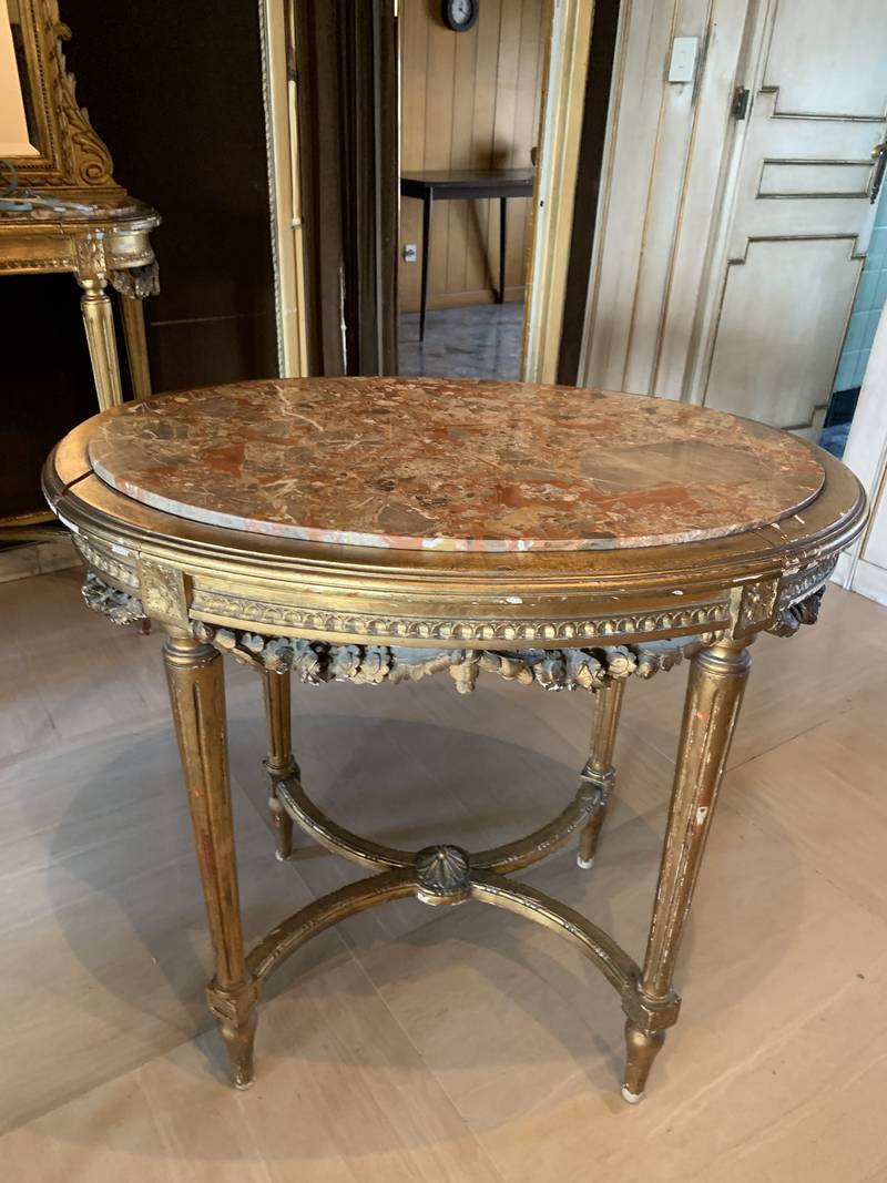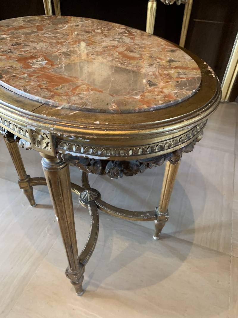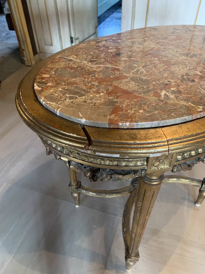 Antico tavolino ovale francese Luigi XVI legno intagliato e dorato piano in marmo
