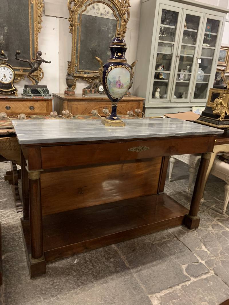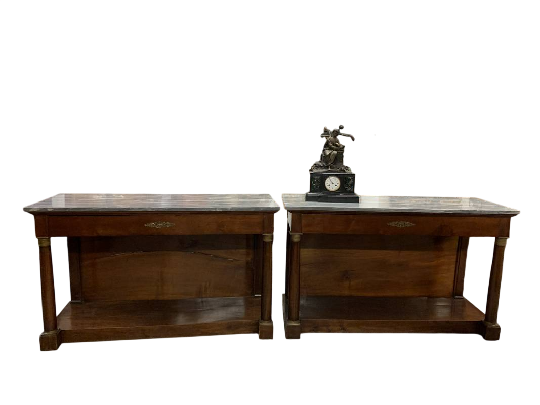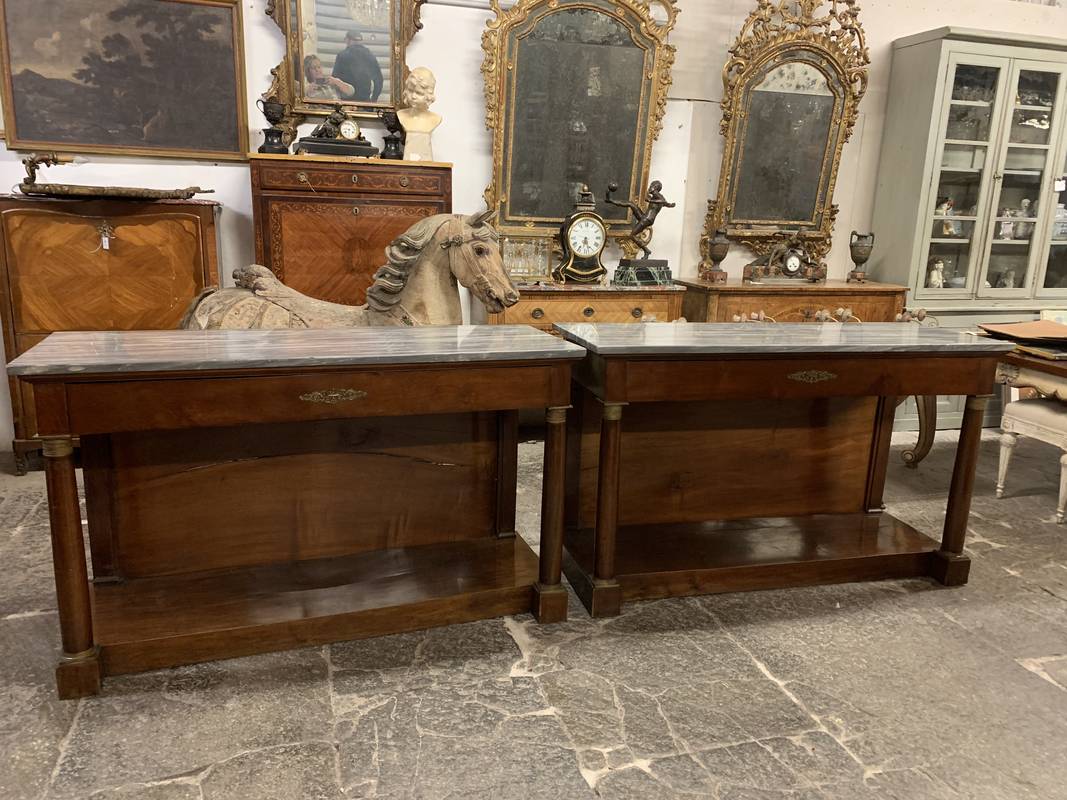 Coppia di antiche consolle Impero colonne e piani in marmo inizi del XIX secolo