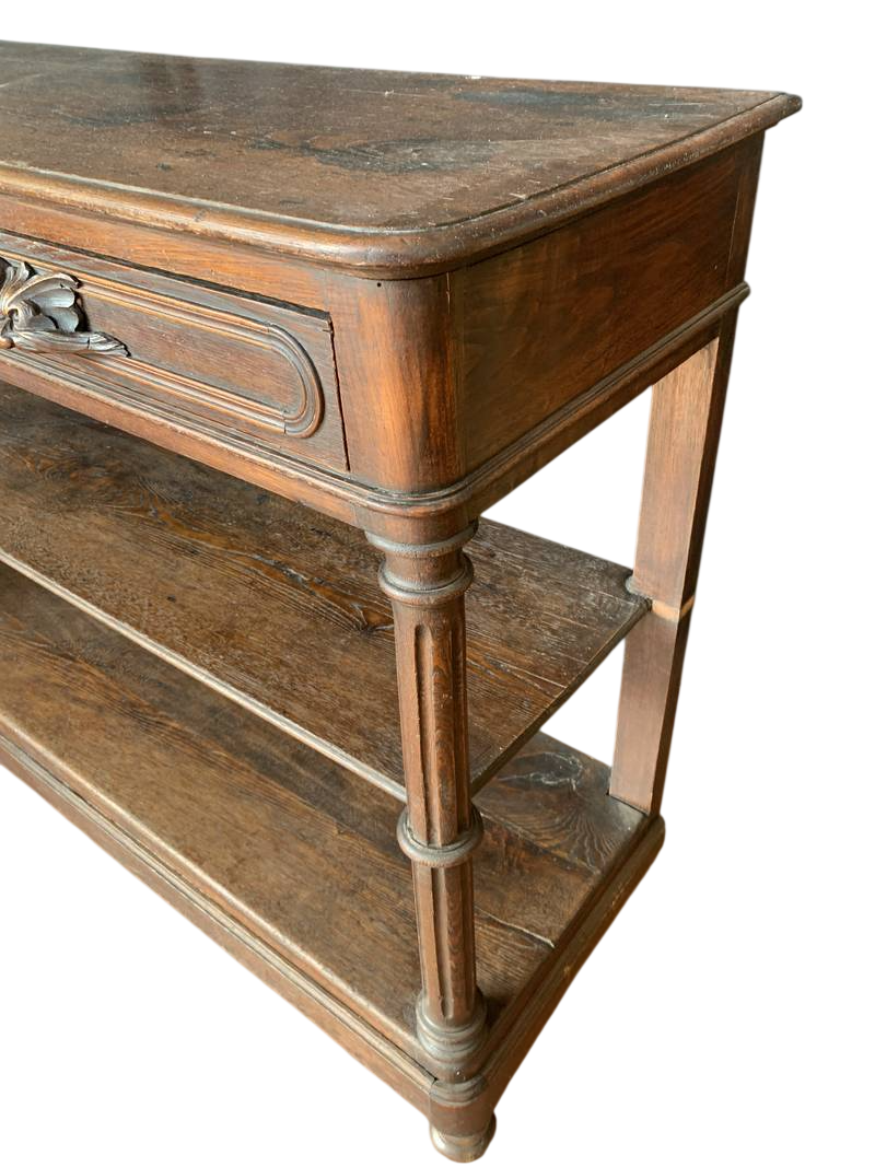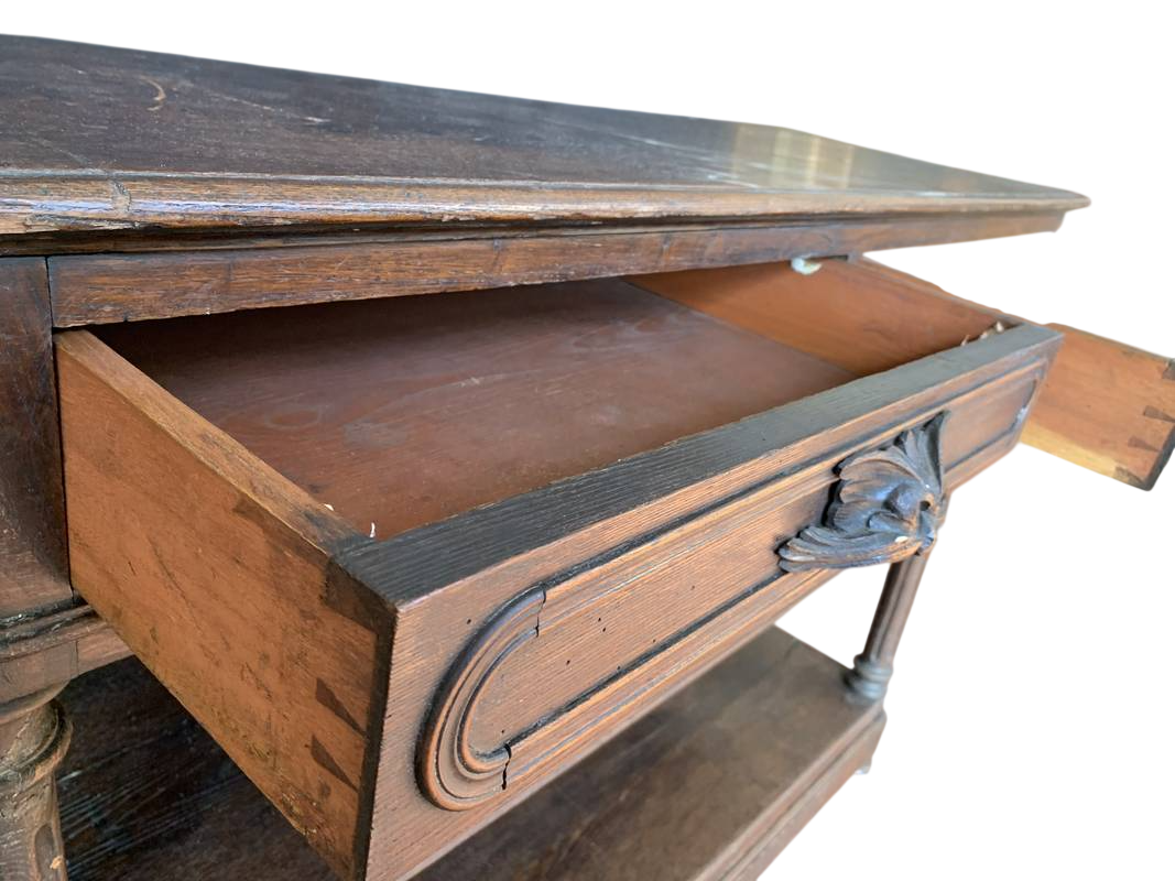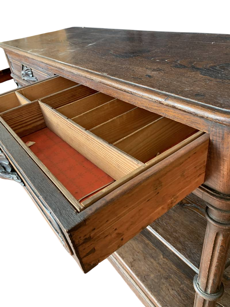 risalente al XIX secolo, caratterizzato da due cassetti con intagli decorativi e ripiani inferiori aperti.