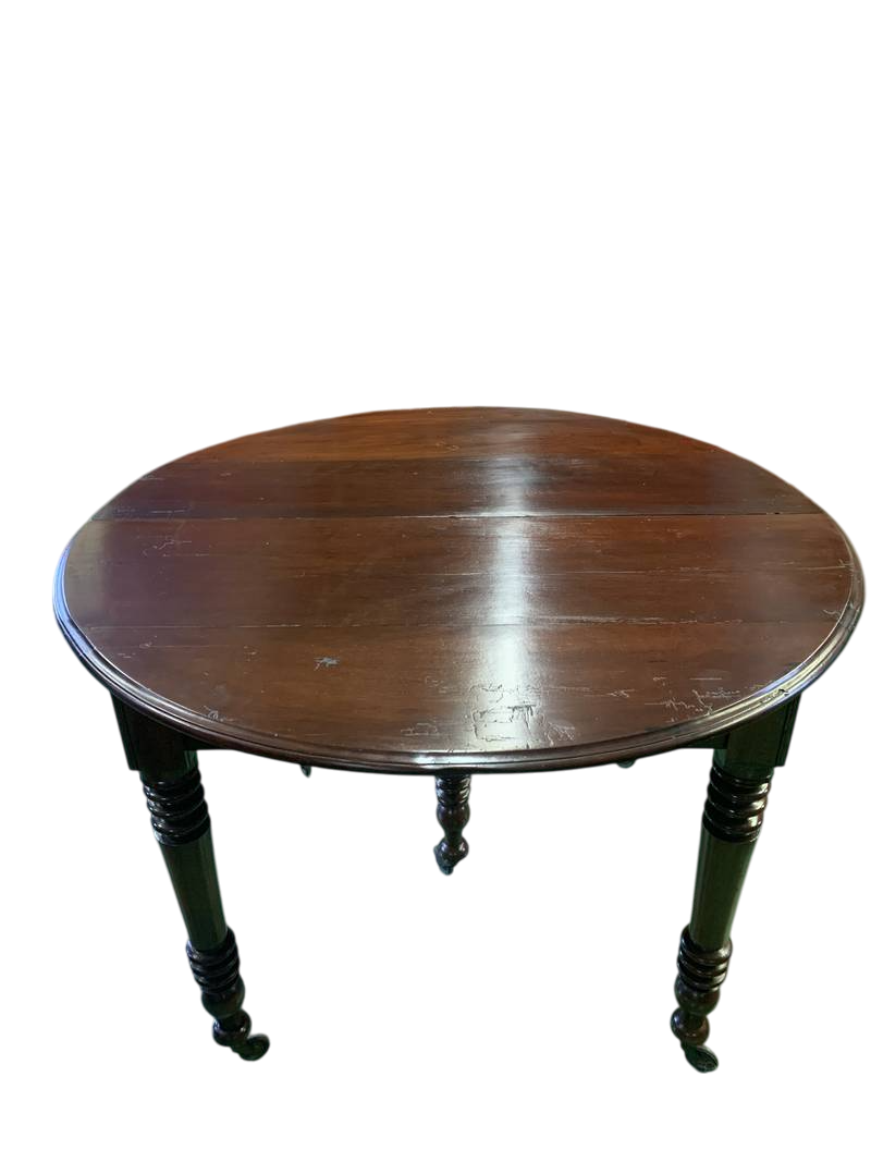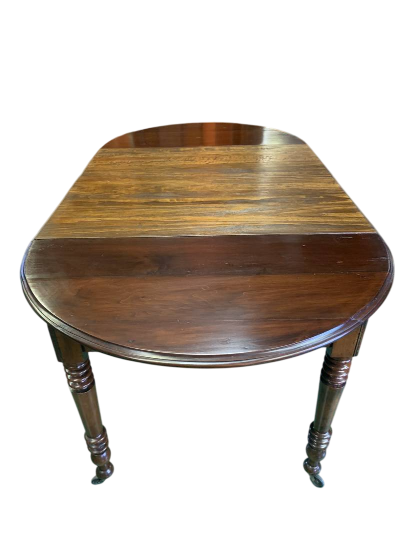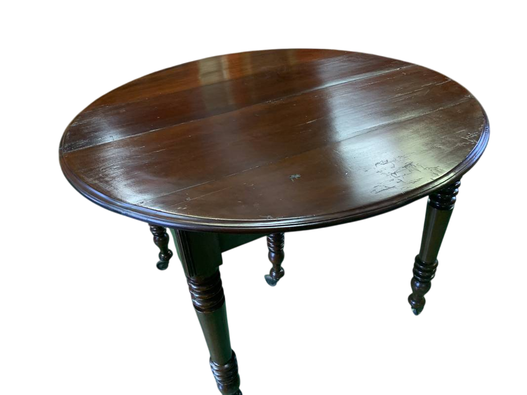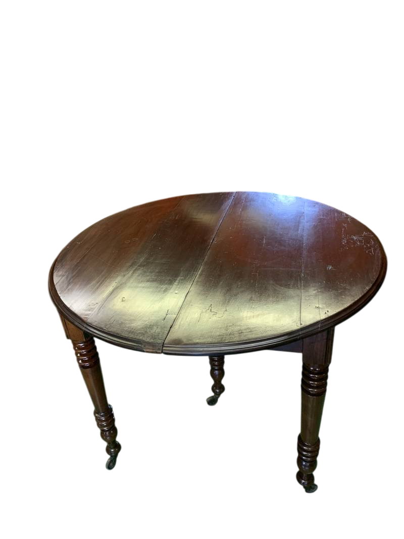 Antico piccolo tavolo rotondo dell’800 piemontese allungabile con 5 gambe tornite e rotelline sul fondo