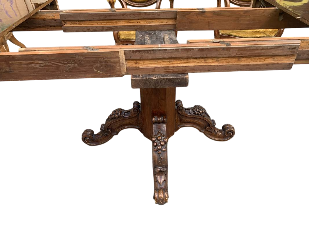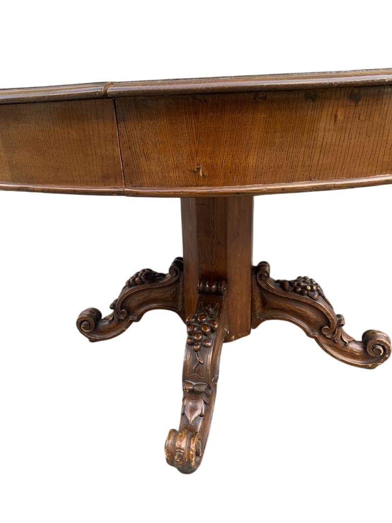 Antico tavolo rotondo allungabile in noce, gamba centrale