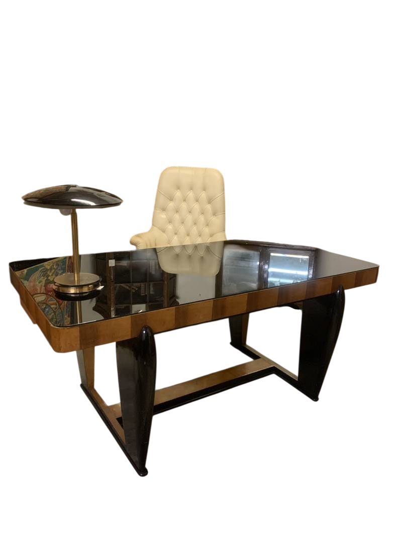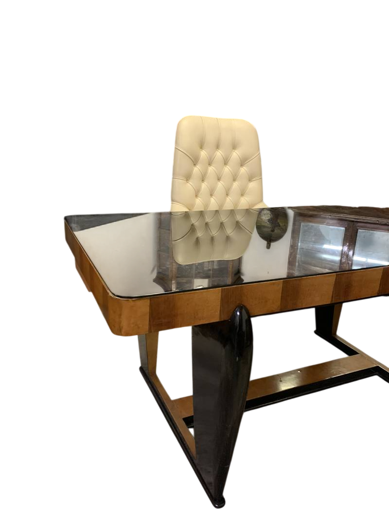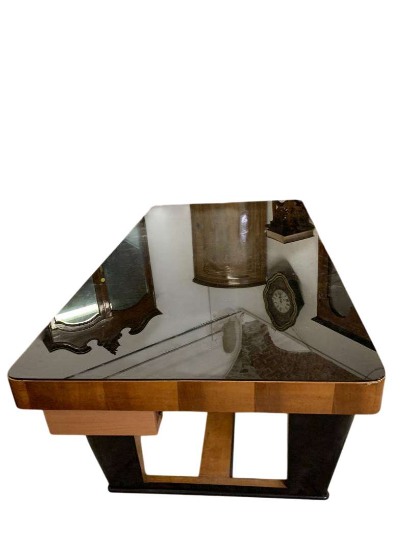 scrivania o un tavolo da pranzo in stile Art Déco a gondola caratterizzato da un piano in vetro e una struttura in legno con dettagli laccati neri. le condizioni sono eccellenti