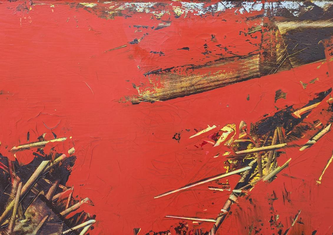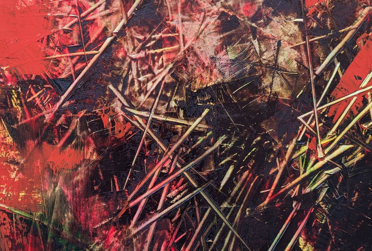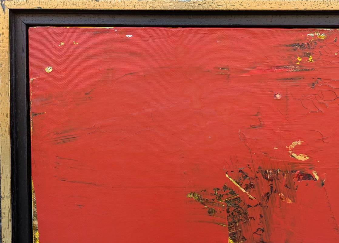 Opera astratta di grandi dimensioni sui toni del rosso e del marrone, caratterizzata da una superficie graffiata, in cui il colore è stato asportato con segni lineari. Al di sopra di questa texture composita è stato spatolato uno strato di rosso intenso. Al retro della tela è presente il titolo Psicopaludoso.