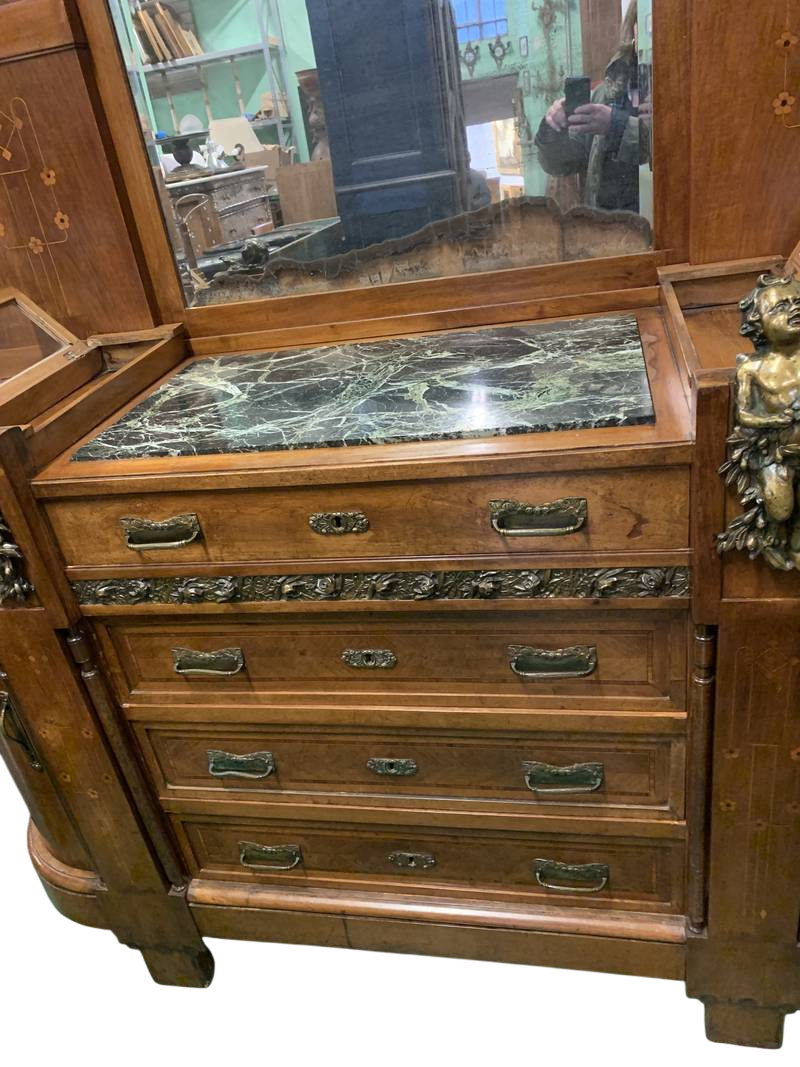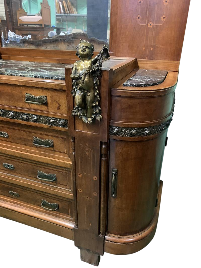 Attrib. Carlo ZEN – Cassettone in noce con specchiera Liberty bassorilievi e bronzi con putti- Inizio XX sec.