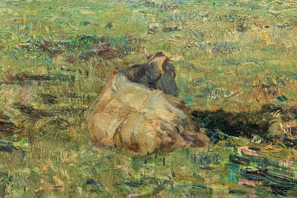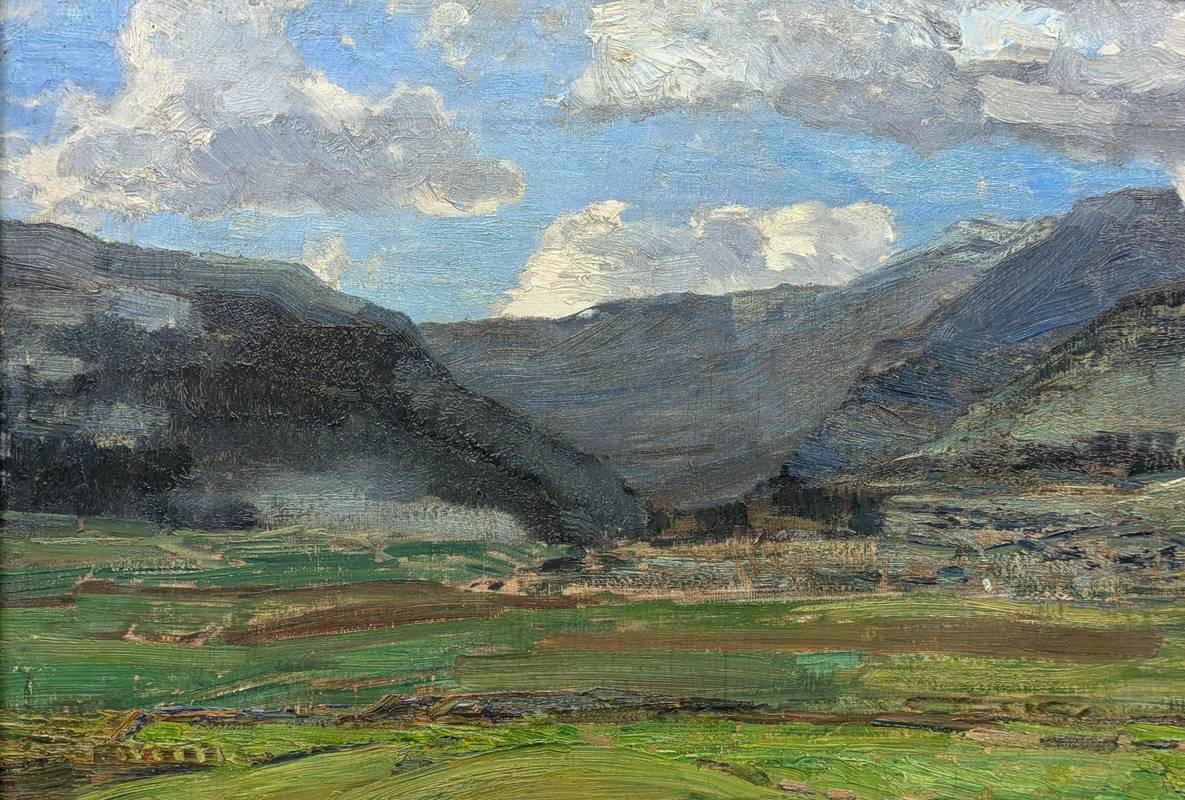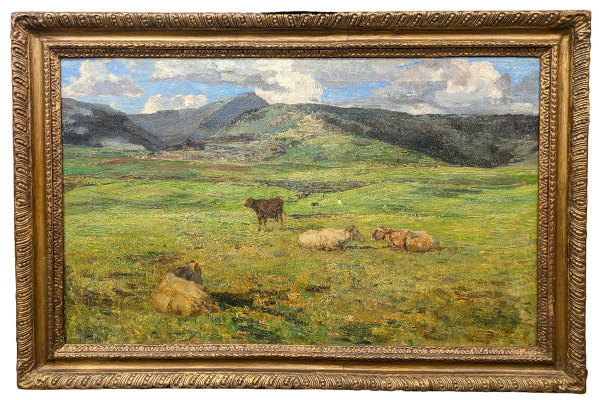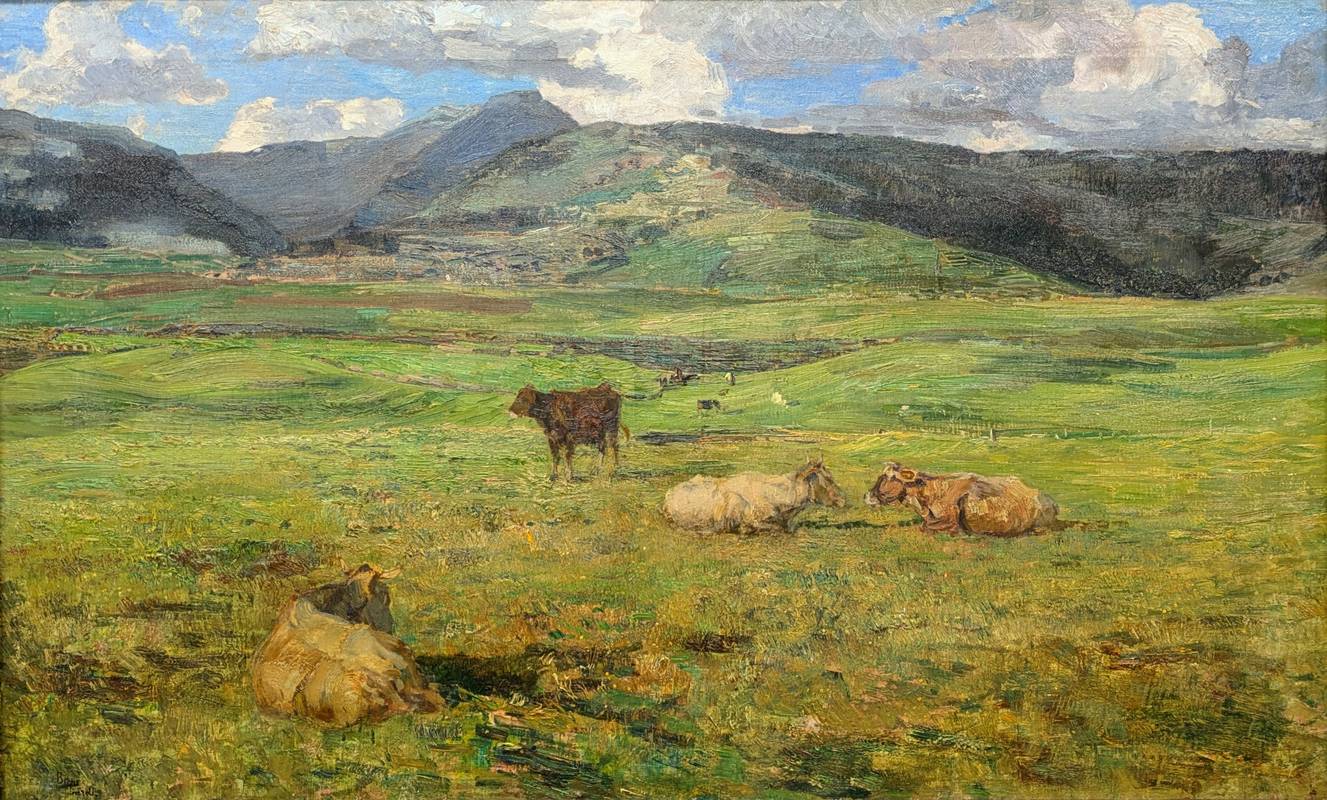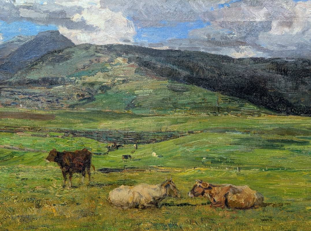 L’opera raffigura una vasta e verdeggiante vallata ai piedi di una catena montuosa, dove vi sono alcune mucche al pascolo.