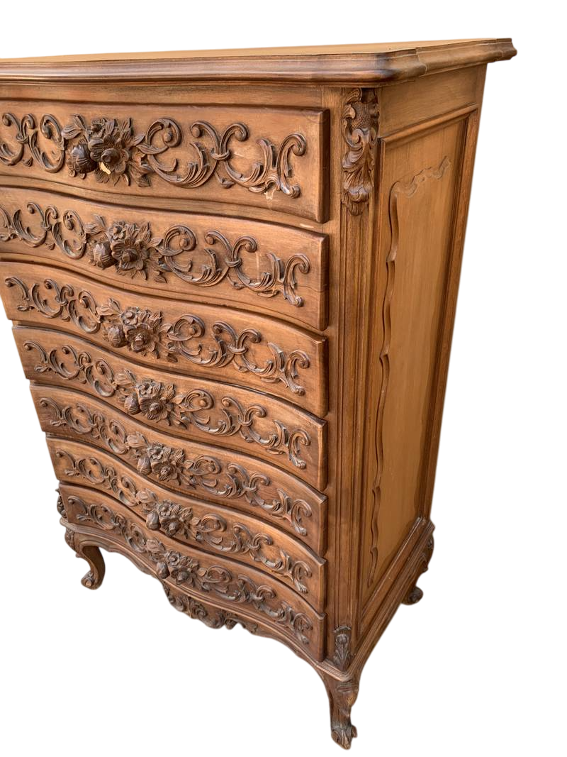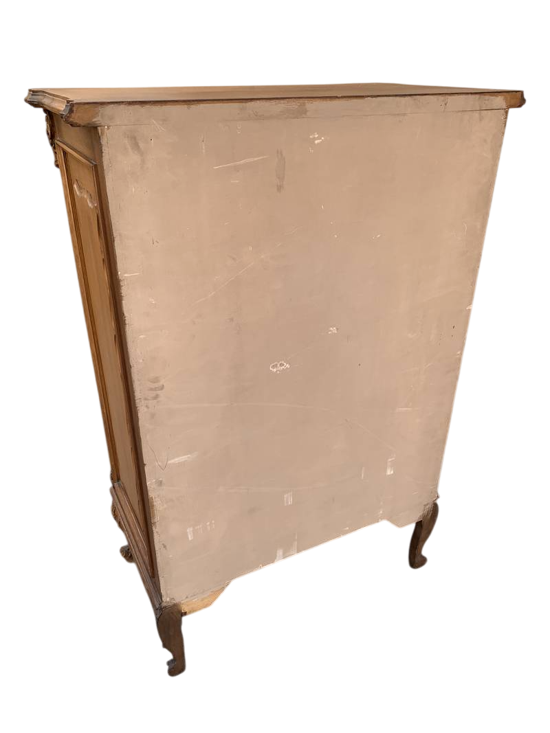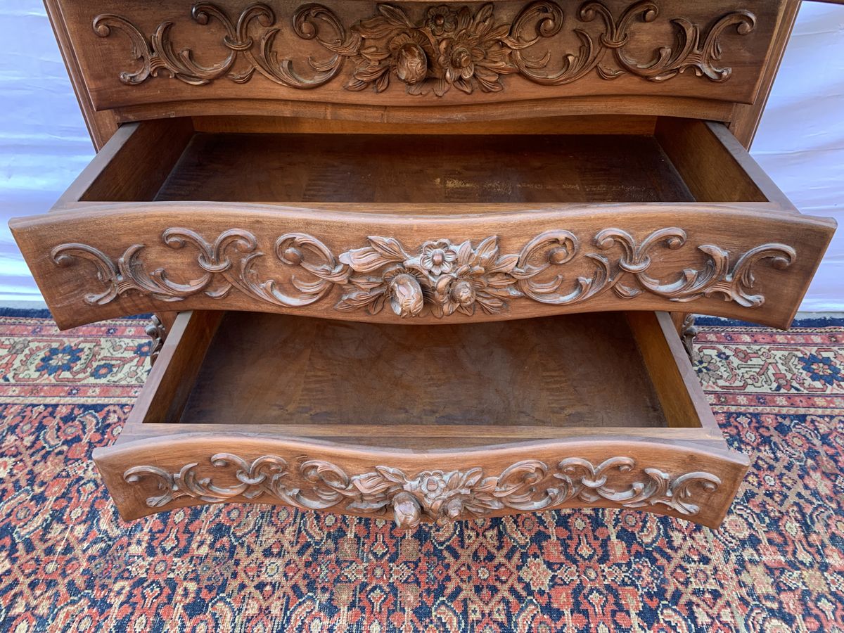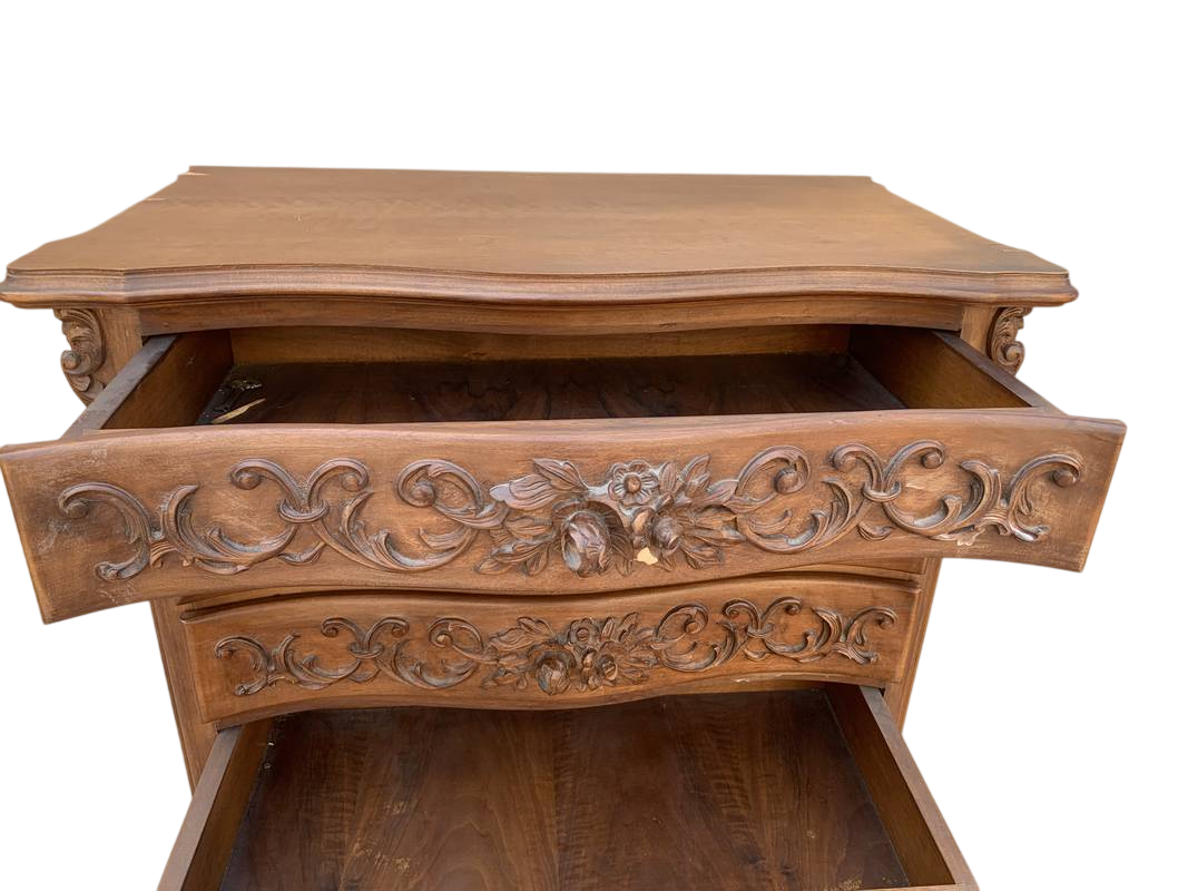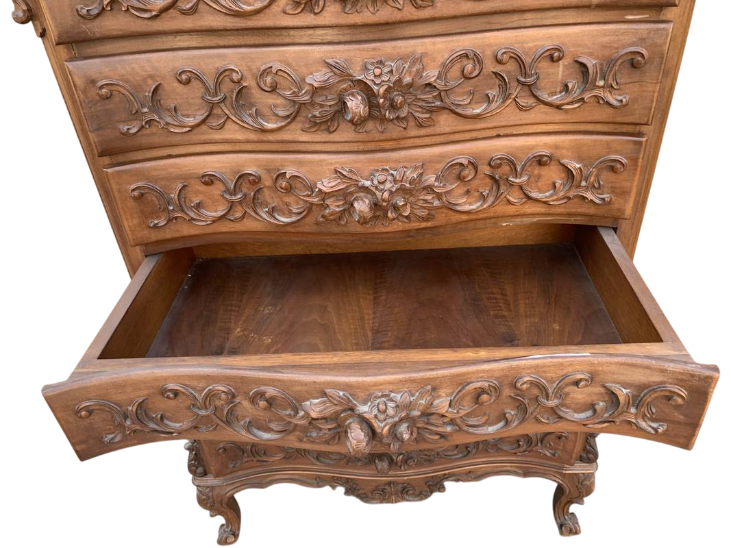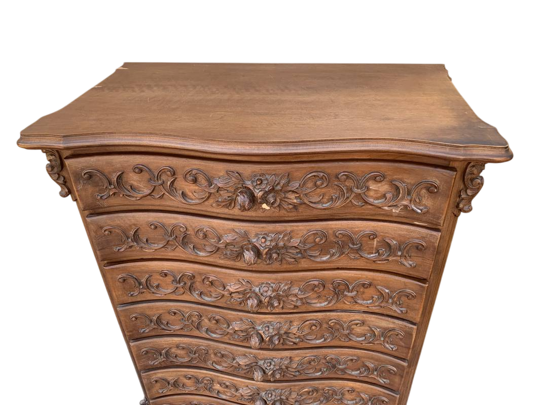 Elegante cassettiera settimanale in noce intagliato barocchetto della prima meta’ del XX secolo