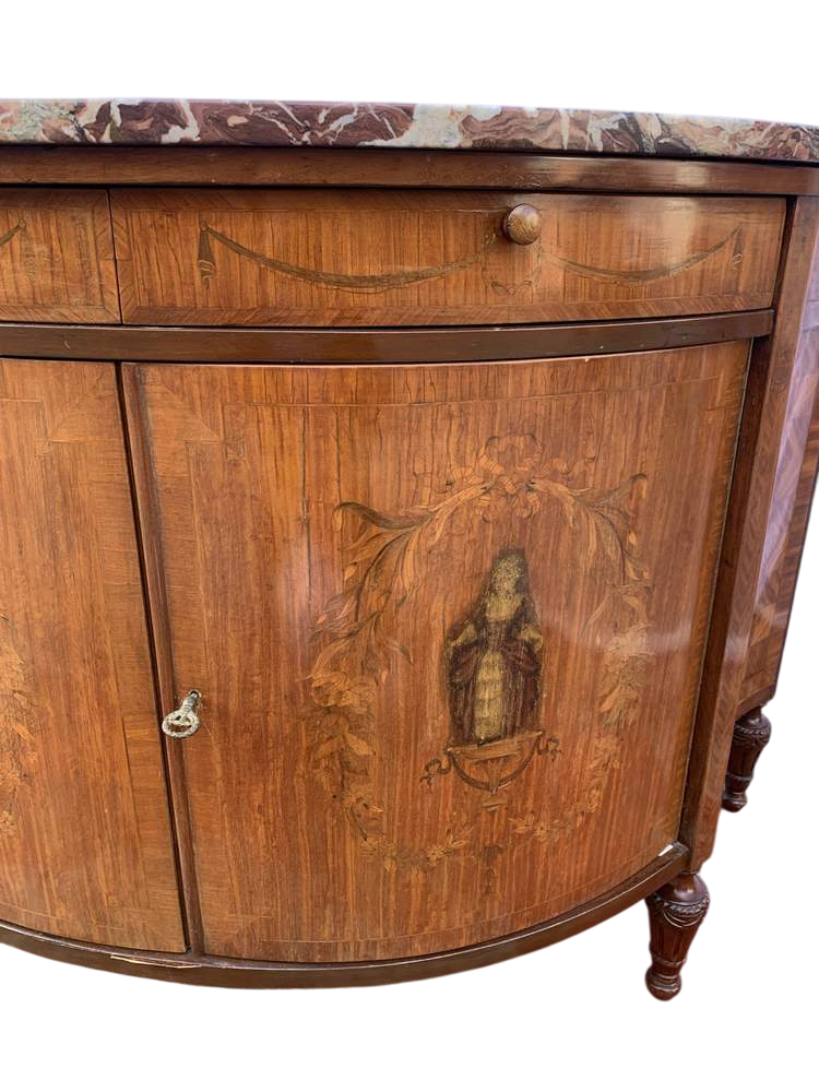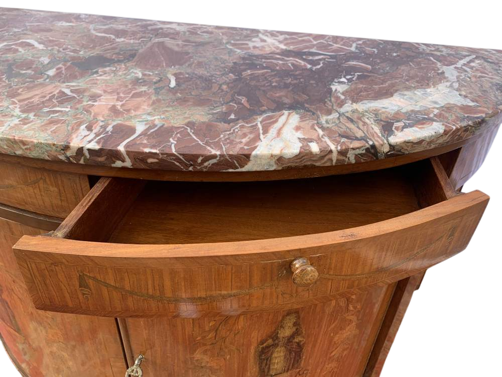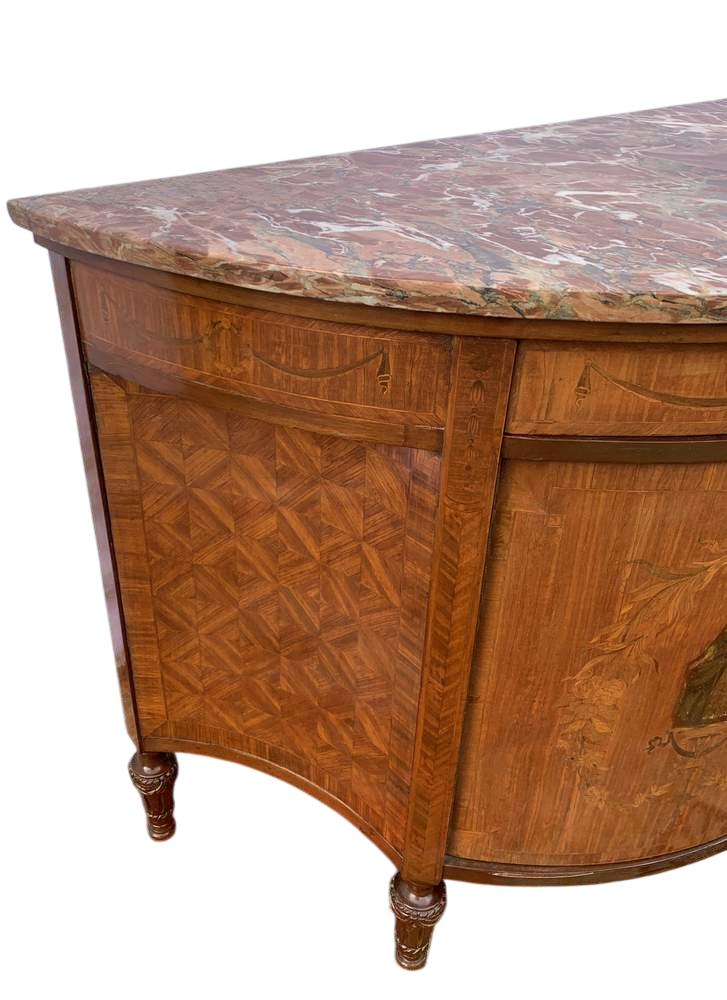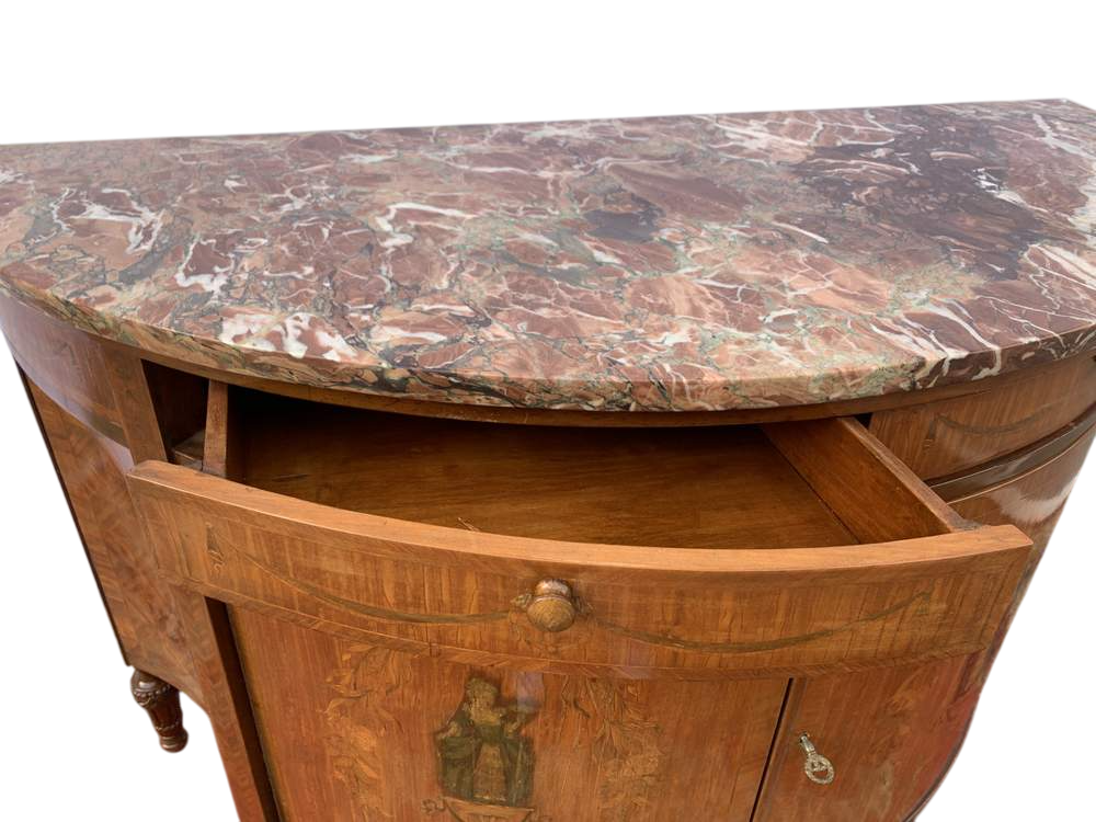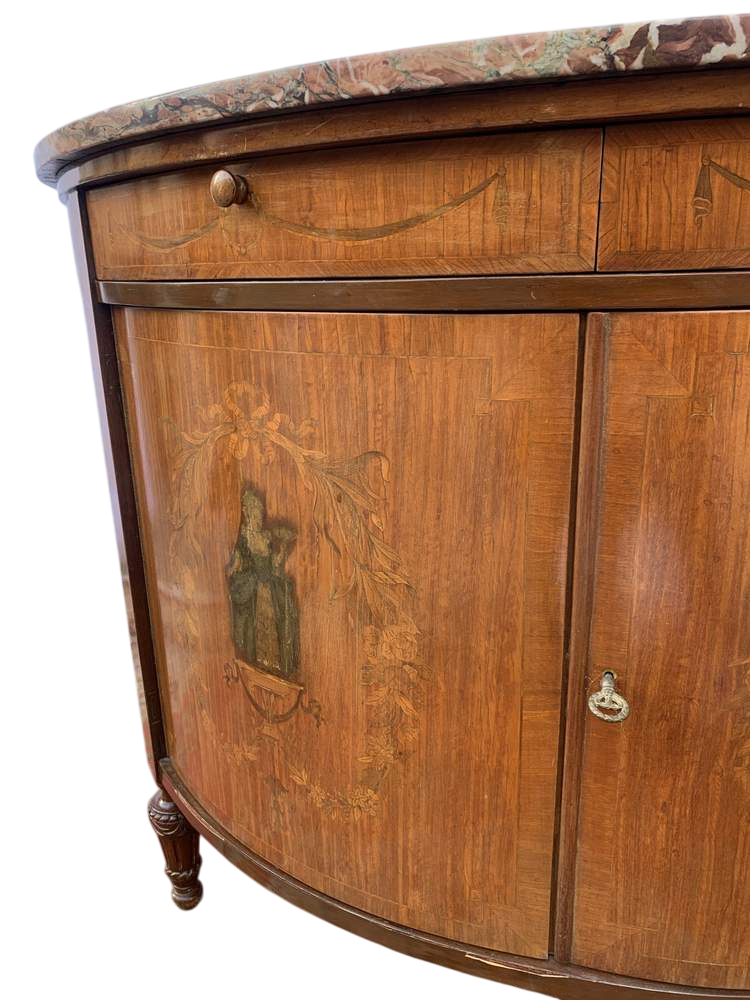 Cassettone inglese a mezzaluna a marquetterie della prima meta’ del XX secolo