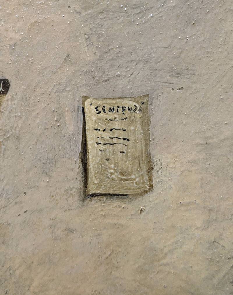 L’opera rappresenta delle figure, probabilmente cospiratori, in una riunione nel palazzo Borromei contro il maresciallo Radetzky nel 1848: vi sono personaggi raffigurati come Pasquale Sottocorno, il Parroco Don Giacomo Gola, Confalonieri Marroncelli e altri. L’episodio è ambientato in uno scantinato con lo stretto necessario, sul muro spoglio spicca un foglio recante la scritta Sentenza.