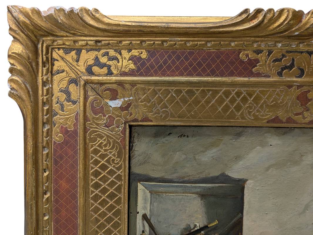 In ottime condizioni conservative come da fotografie, entro cornice in legno scolpita, intagliata e dorata, con parti laccate. Si segnalano lievi mancanze relative alla cornice.