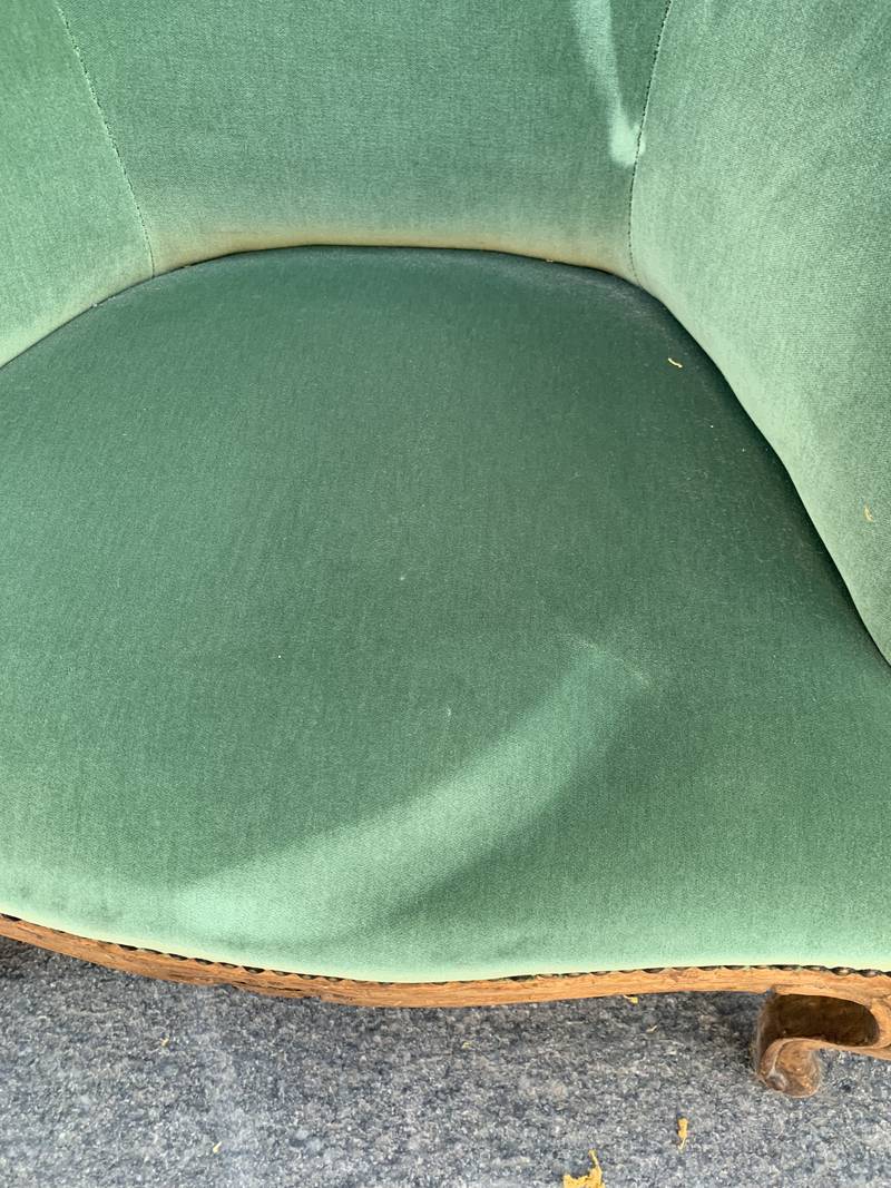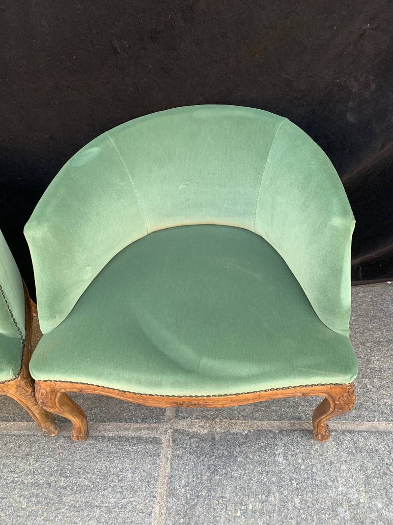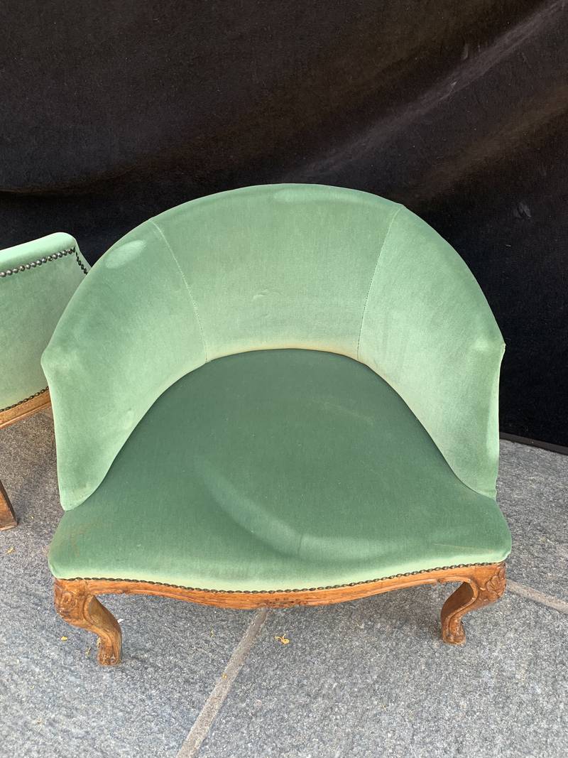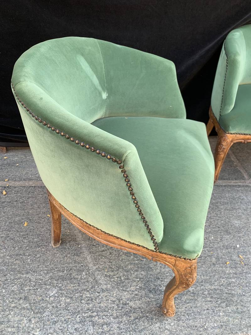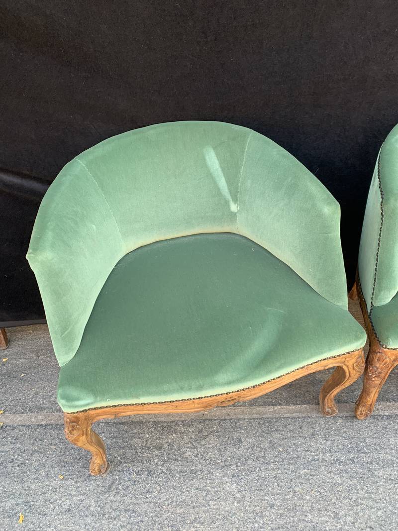 Coppia antiche poltrone poltroncine a pozzetto Art Deco’ velluto verde con gambe mosse