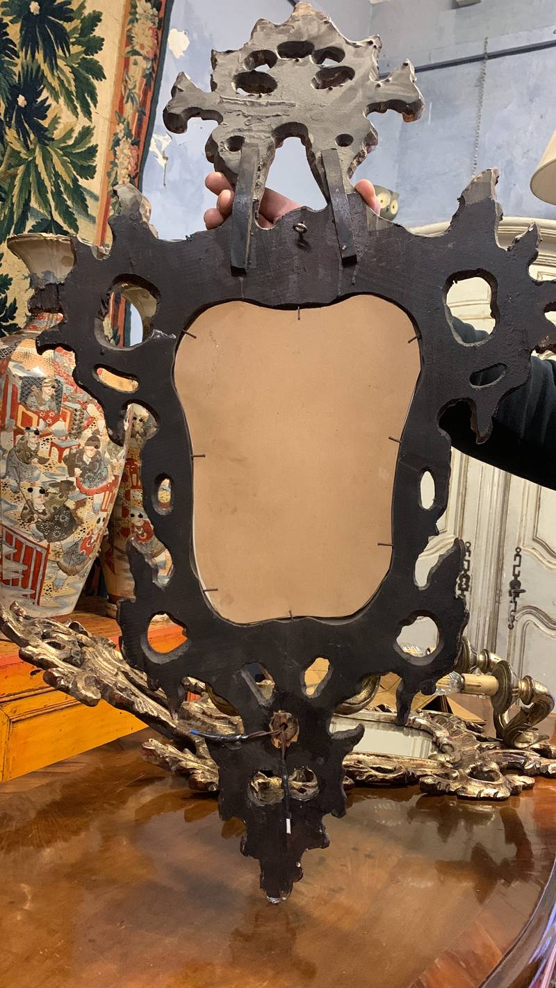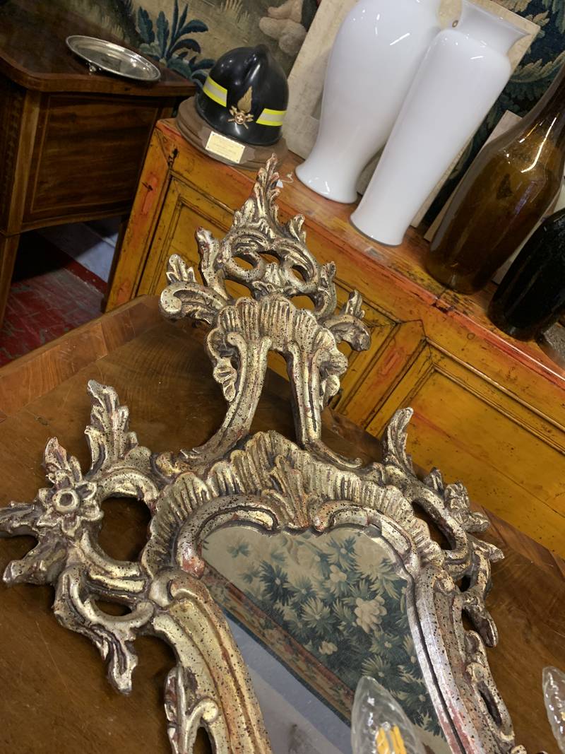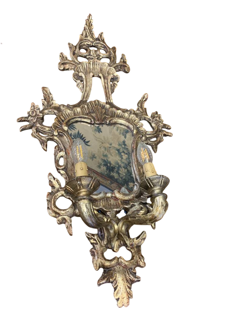 Coppia di antiche specchiere con applique in legno intagliato e meccato della prima meta’ del XX secolo