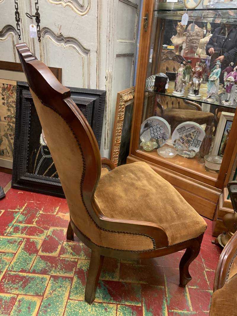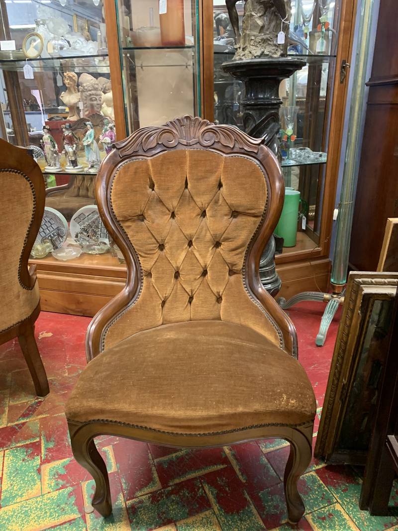 Coppia di antiche poltroncine in noce intagliato imbottite capitone’ del XX secolo