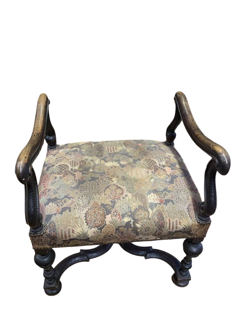 in legno di noce riccamente intagliato grandi braccioli a ricciolo , piedi scolpiti a zampa di leone sedute e schienali imbottiti in tessuto arazzo