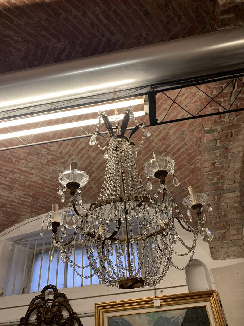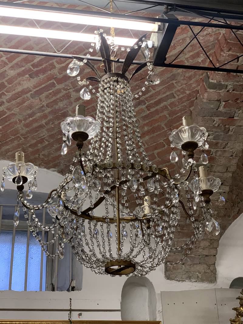 struttura metallica a forma di gabbia o cestello rivestita da numerosi pendenti in cristallo.