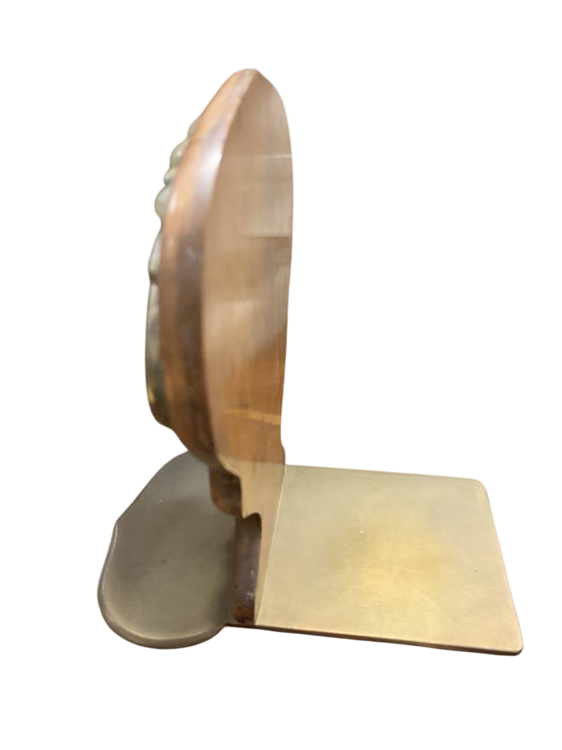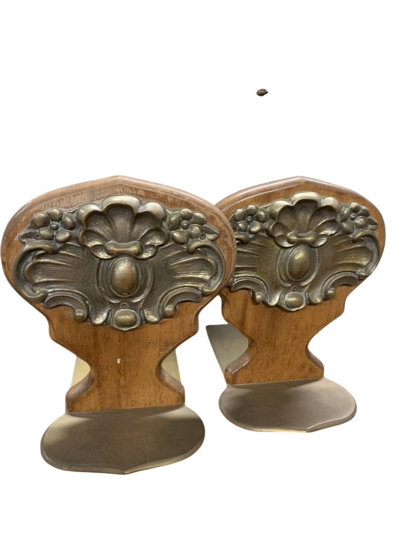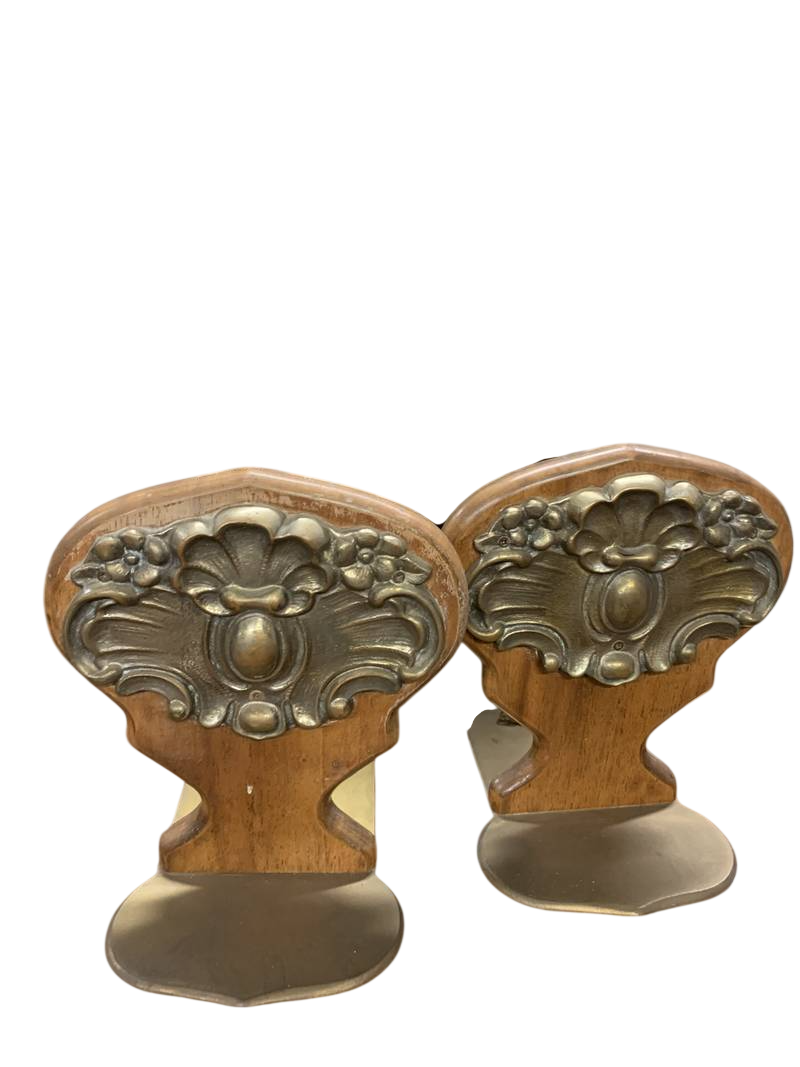 Coppia di fermalibri reggilibri antichi metallo dorato e legno primi del 900