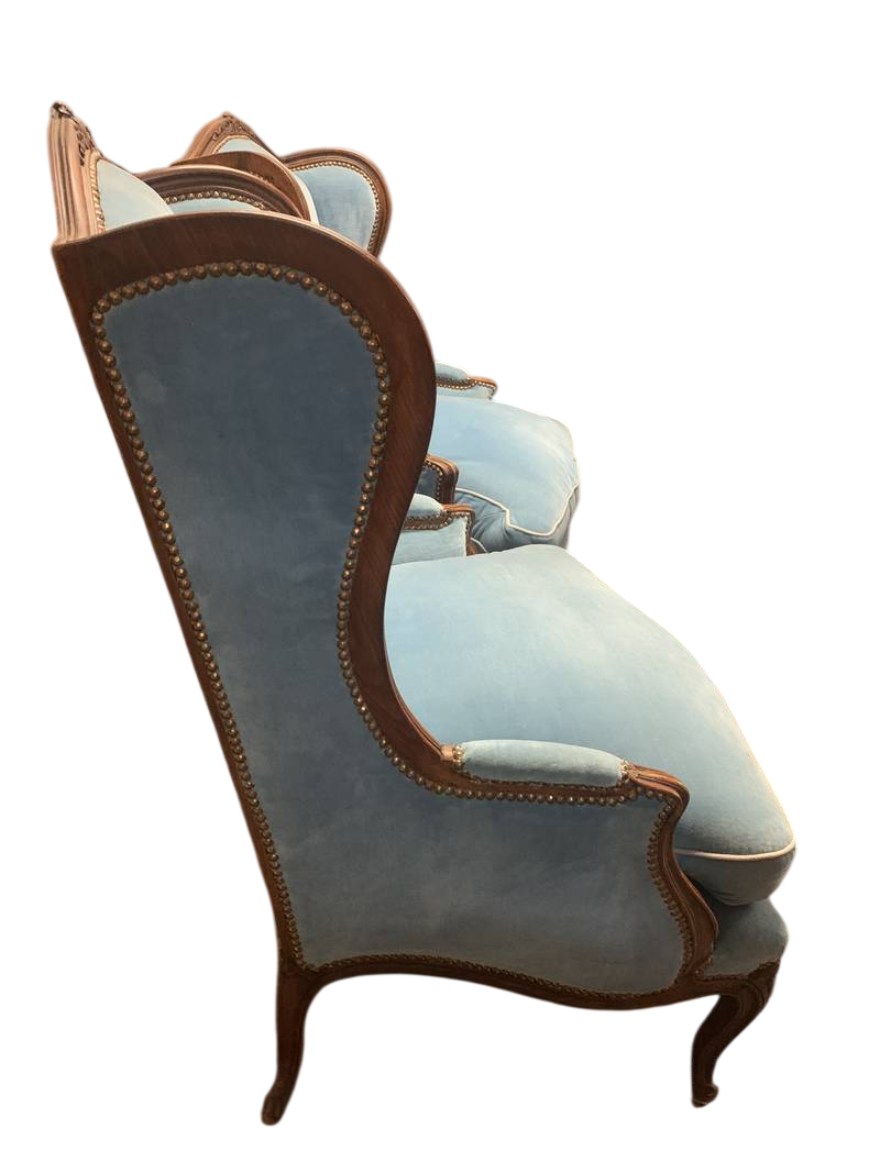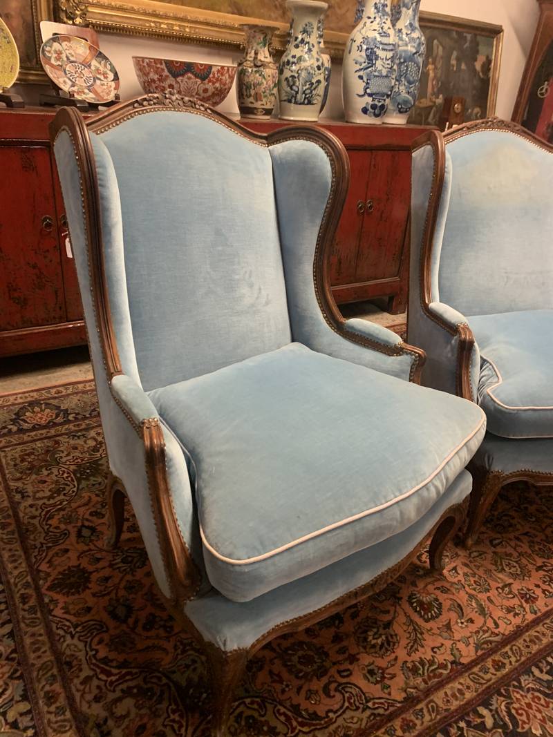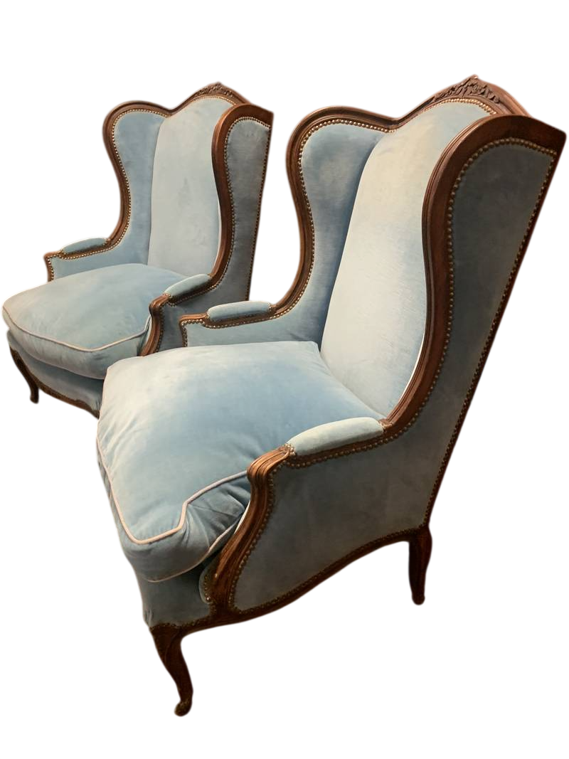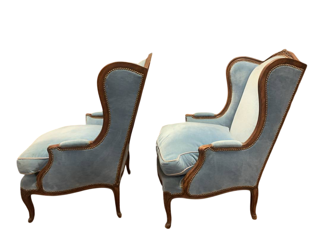 una coppia di poltrone bergère in stile Luigi XV in velluto azzurro con struttura in legno intagliato a vista