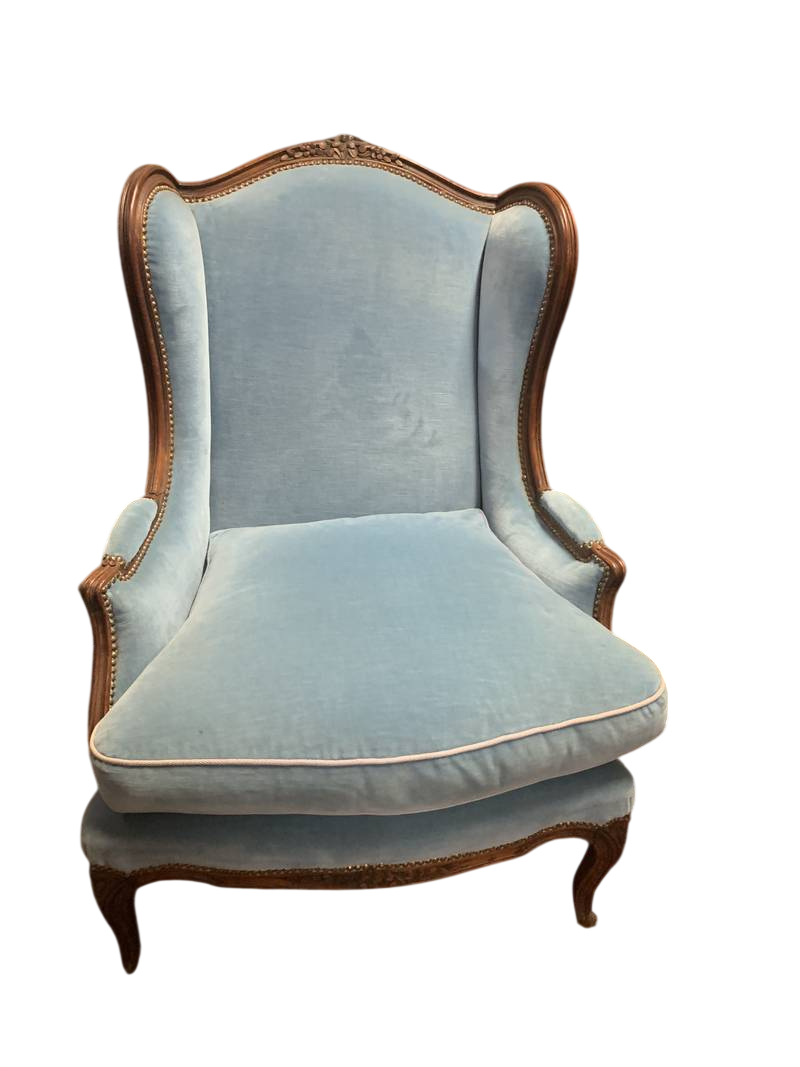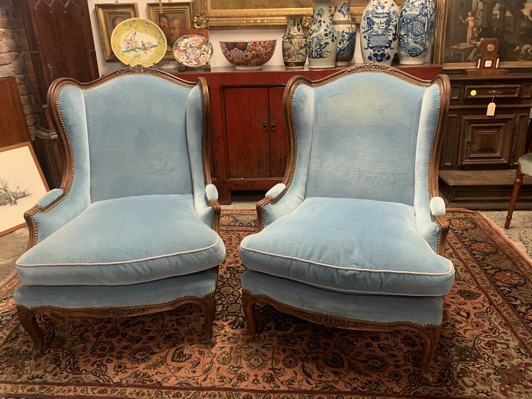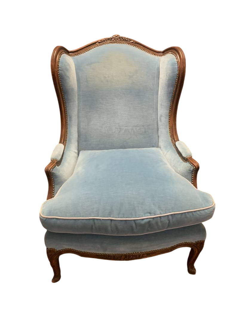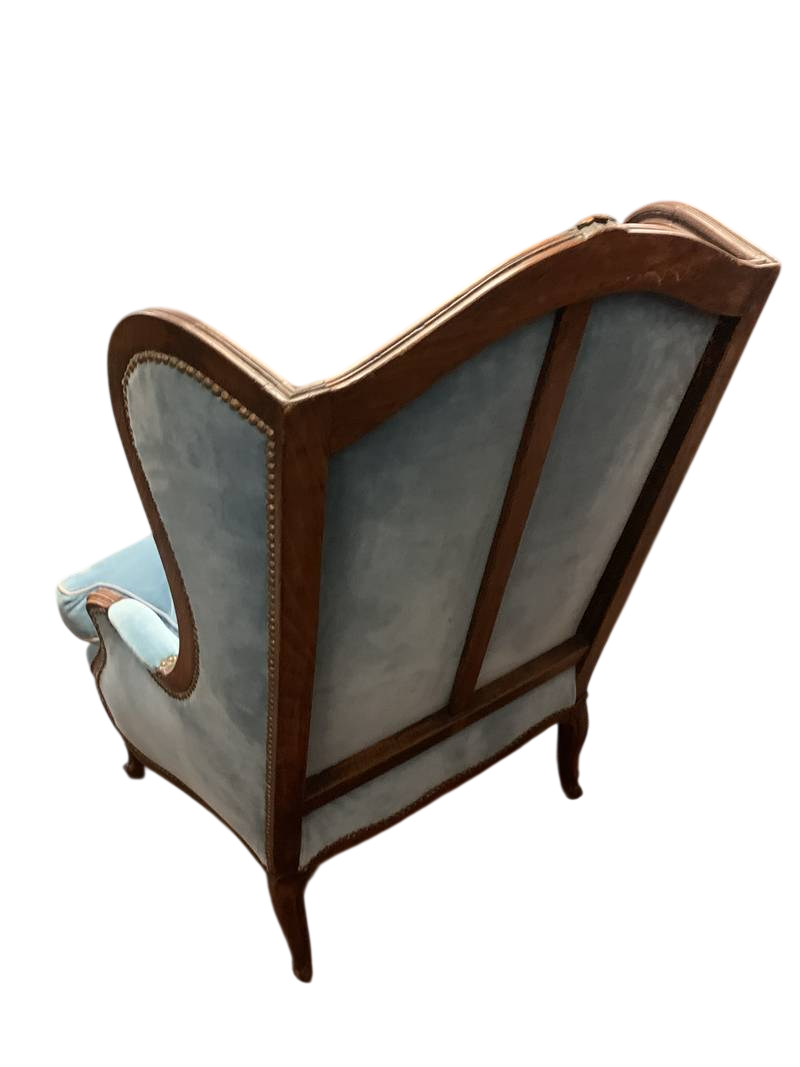 una coppia di poltrone bergère in stile Luigi XV in velluto azzurro con struttura in legno intagliato a vista