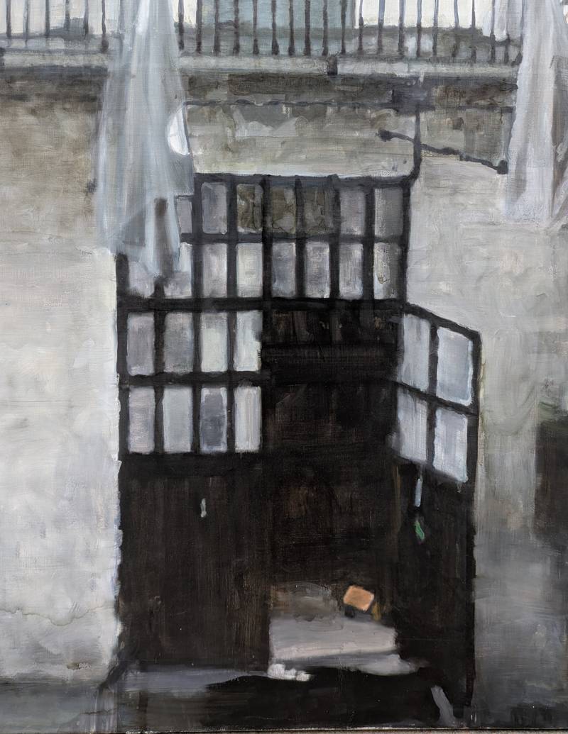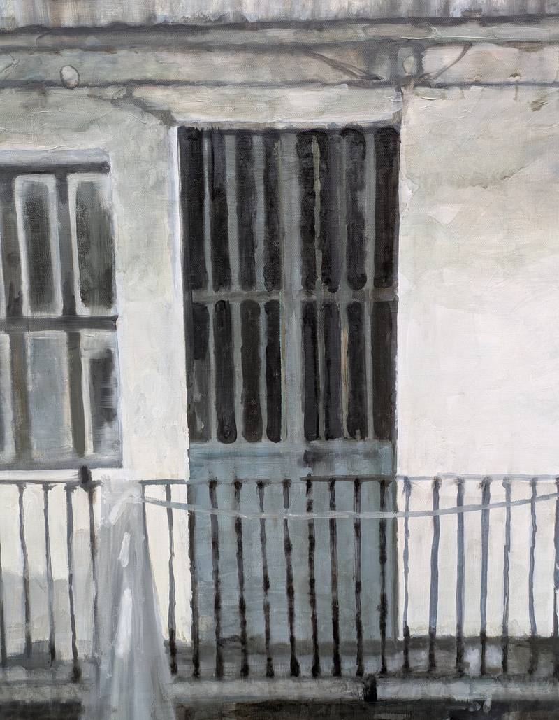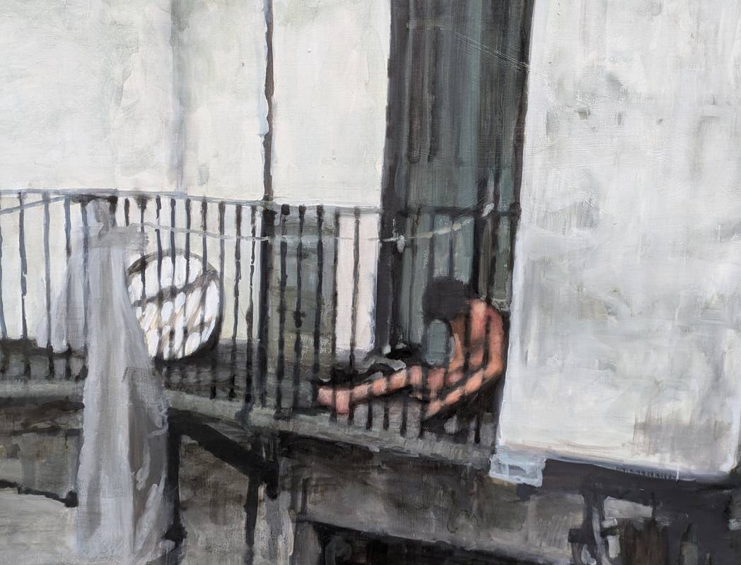 L’opera ritrae la facciata interna di un edificio popolare con un ballatoio, resa con una scarna palette di colori freddi. Nell’angolo a destra del balcone giace una figura nuda, seduta a terra e con la testa bassa.