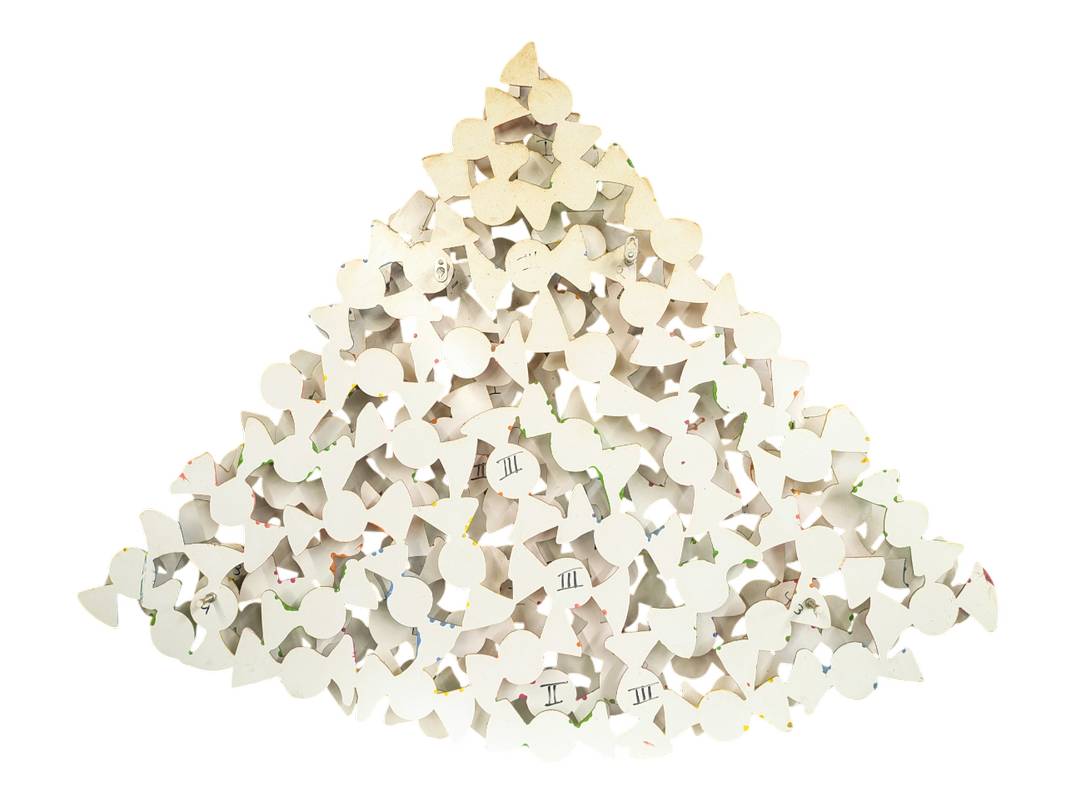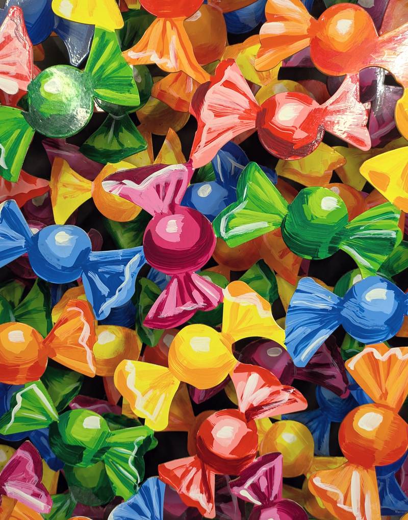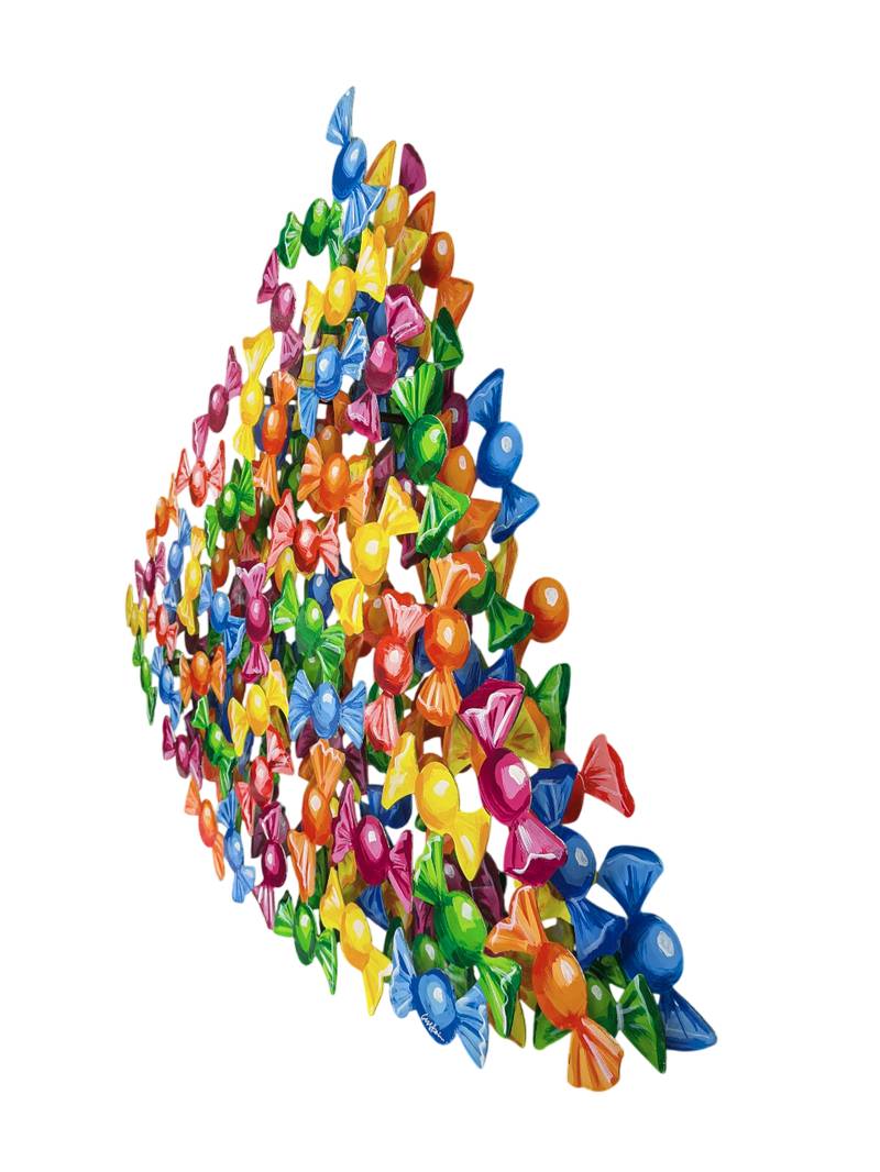 Multiplo n° 7 in edizione limitata di 150 pezzi, composto da tre lastre metalliche sovrapposte. Ogni pannello ritrae numerose caramelle colorate, che sovrapposte danno un notevole senso di profondità.