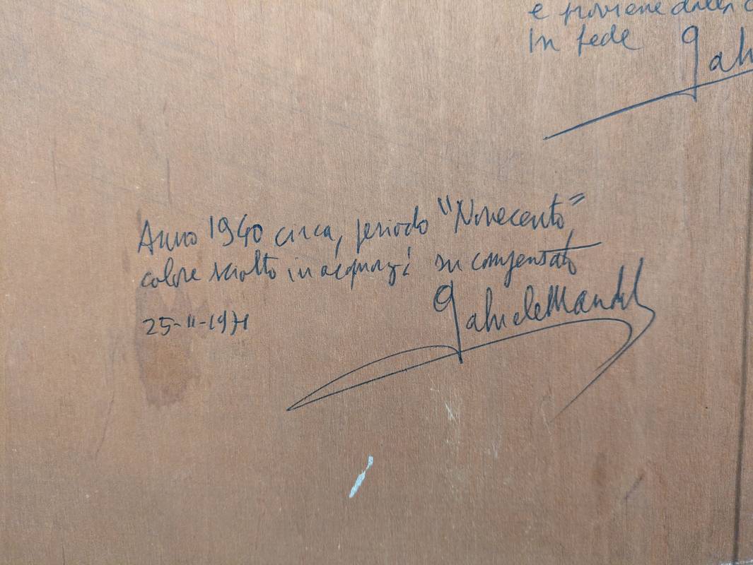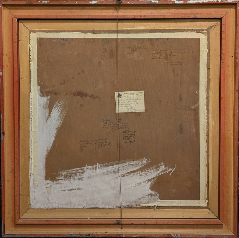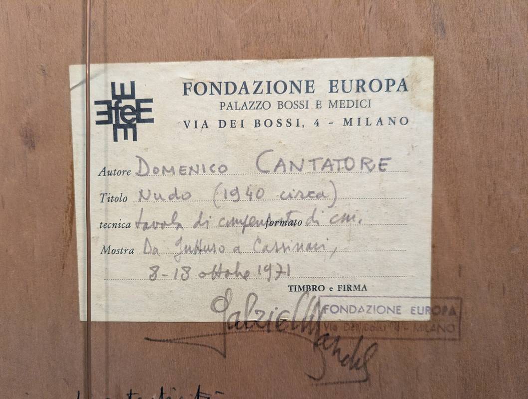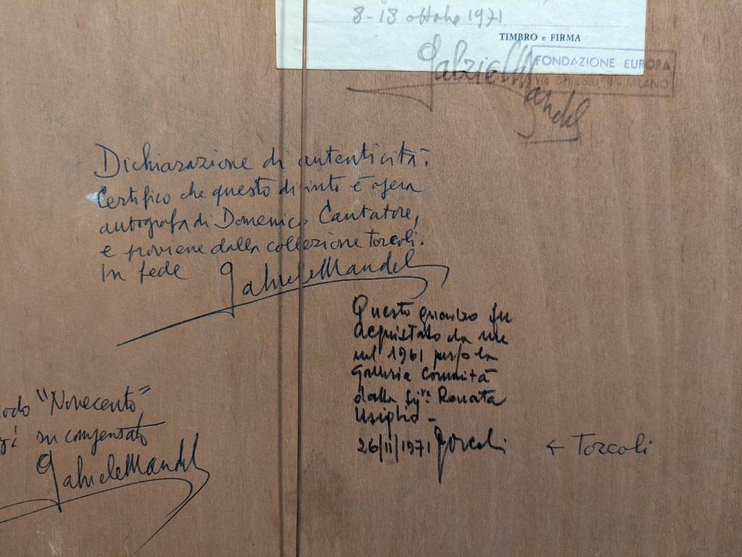 Al retro è presente un cartiglio della Fondazione Europa che testimonia il coinvolgimento dell’opera nella mostra Da Guttuso a Cassinari (1971). Inoltre, vi è la dichiarazione di autenticità firmata dallo storico dell’arte Gabriele Mandel.