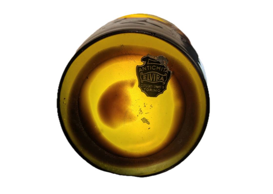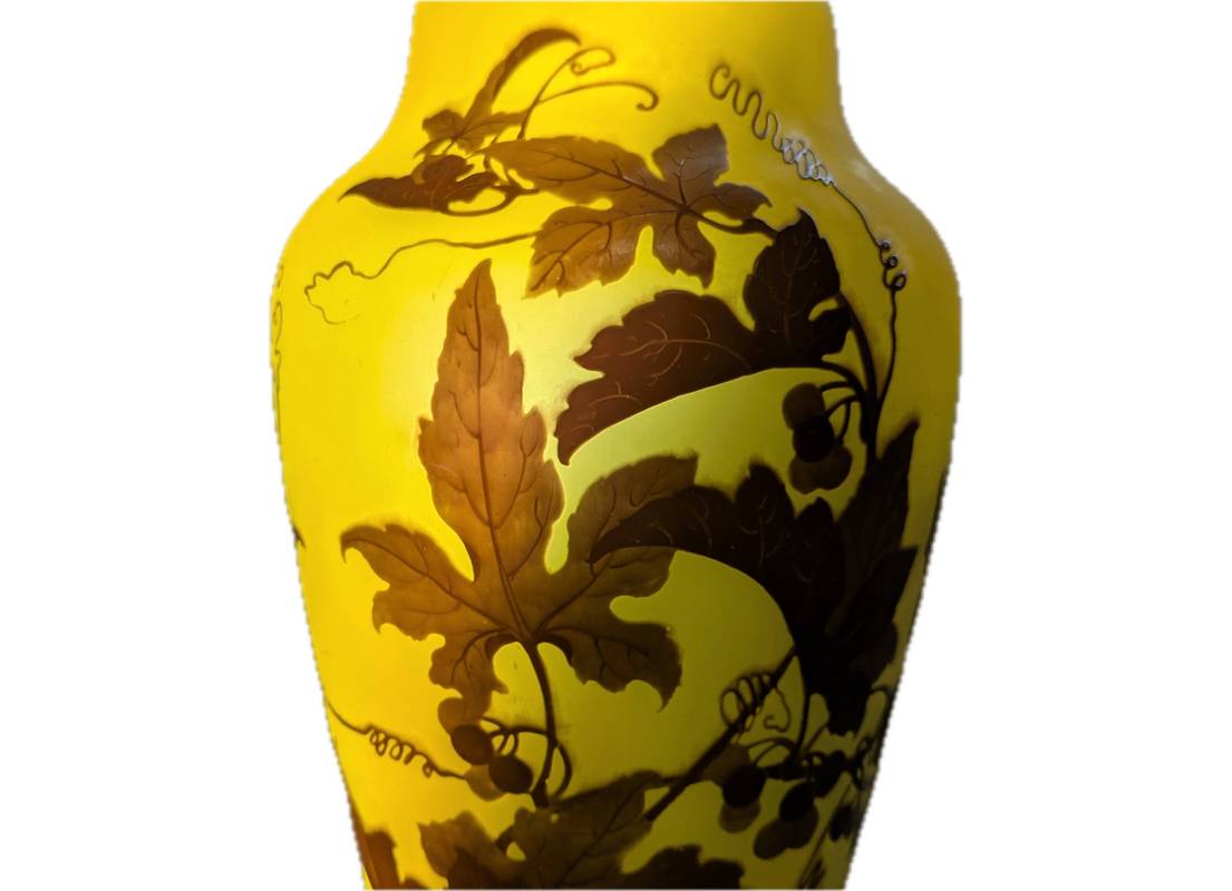 Vetro cammeo inciso all’acido con disegno di foglie di vite marroni violacee su fondo giallo caldo, con un forte contrasto cromatico che ne esalta i colori. Il motivo vegetale decora l’intera superficie del vaso, con un lieve effetto chiaroscurale.