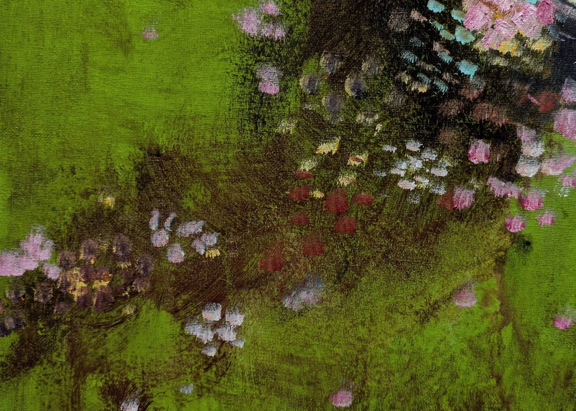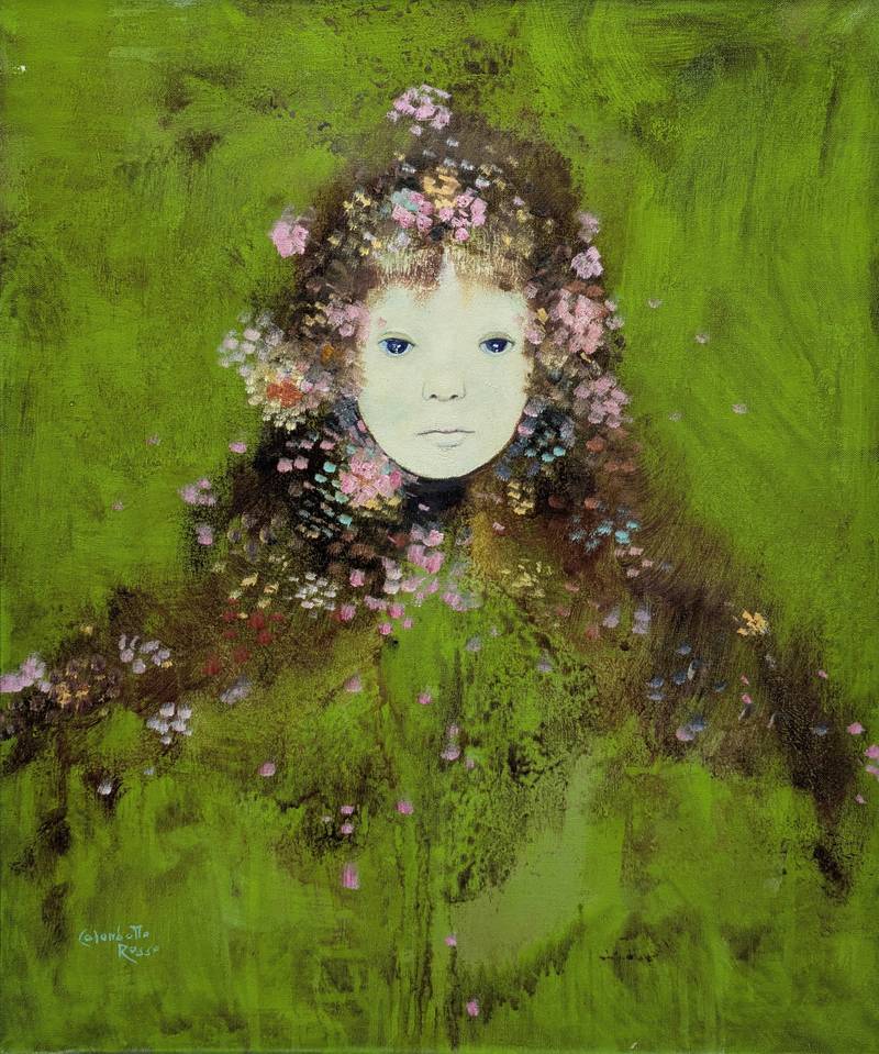 L’opera ritrae il volto di una bambina immerso in uno sfondo verde simile a un prato, il cui viso è incorniciato da fiori minuti, creando una chioma vaporosa e leggera.