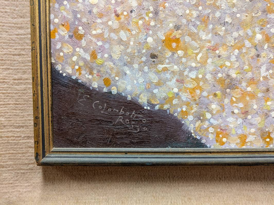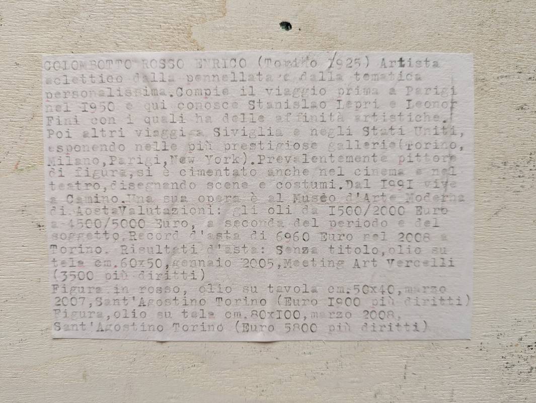 Dipinto a olio su tavola firmato in basso a sinistra Enrico Colombotto Rosso (Torino, 1925 – Casale Monferrato, 2013), pittore italiano.