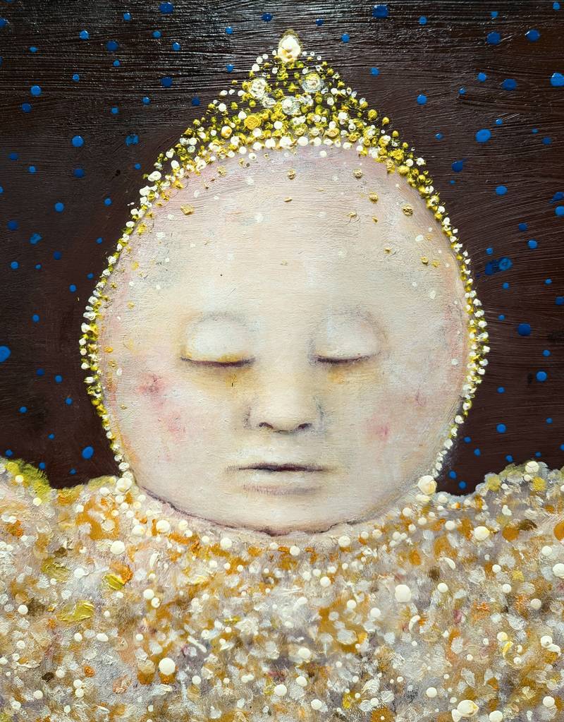 Nella rappresentazione la bambina dorme serenamente, sospesa in una notte cosparsa di stelle blu.