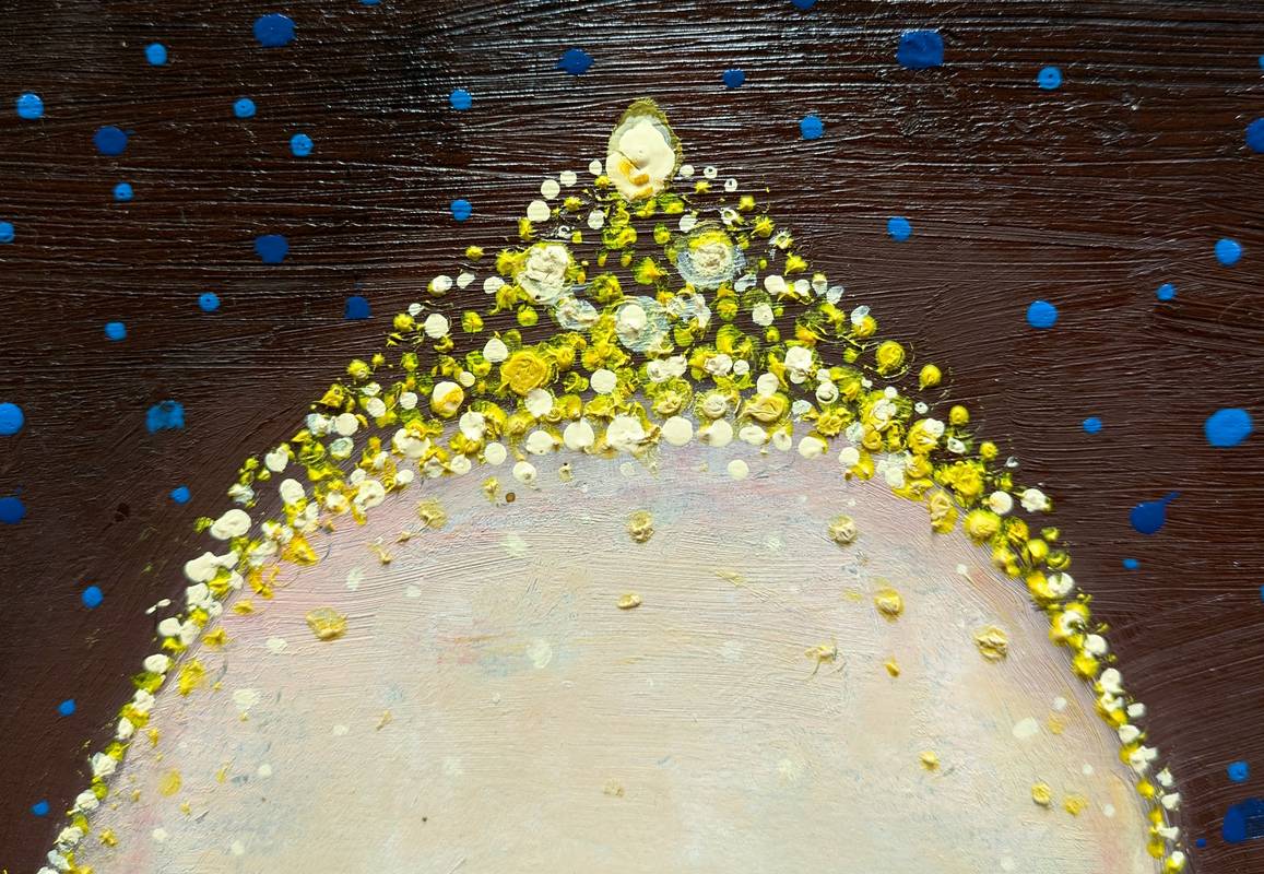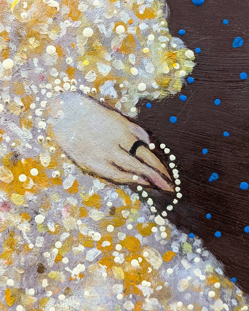 L’opera ritrae una bambina con un vestito che appare impalpabile, punteggiato da frammenti luminosi, mentre sul capo vi è appoggiata una sottile tiara dorata. Raffigurata in posizione perfettamente frontale rispetto all’osservatore, la piccola tiene in entrambe le mani due bracciali di perline.