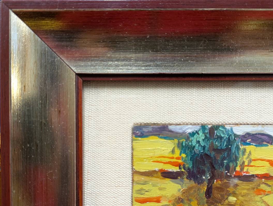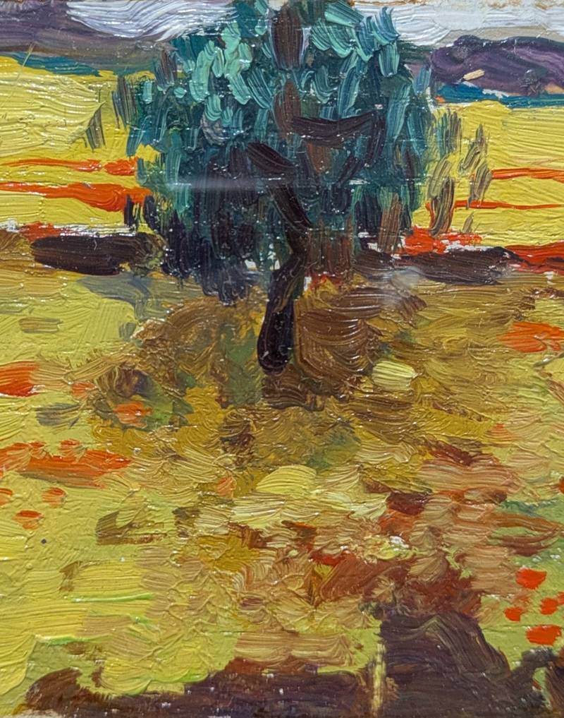 Opera di piccole dimensioni raffigurante un campo di grano con al centro un albero solitario.