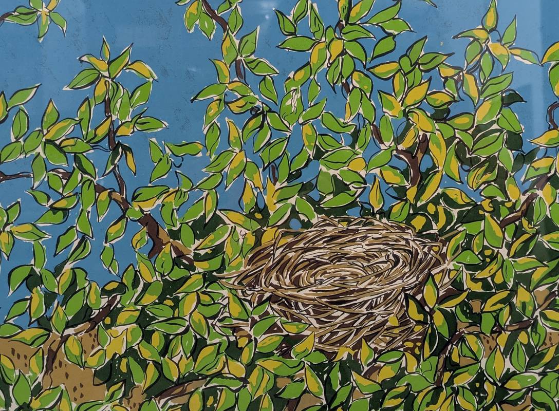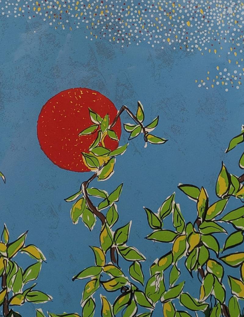 L’opera raffigura un nido tra i rami di un albero, mentre nel cielo azzurro vi è un sole rossastro.