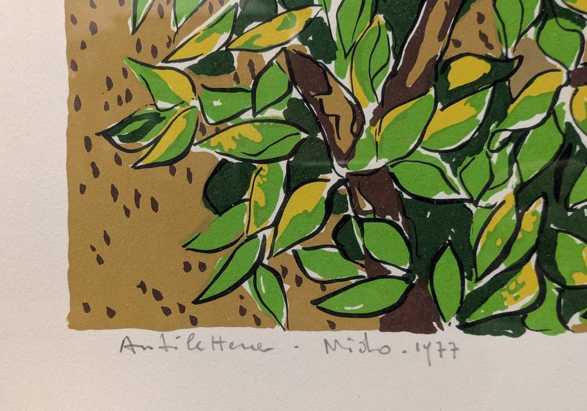 Stampa da serigrafia datata 1977 e firmata in basso a destra Ettore Fico (Piatto, 21 settembre 1917 – Torino, 28 dicembre 2004), pittore piemontese. La firma dell’artista è accompagnata da una dedica.