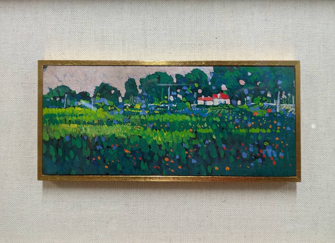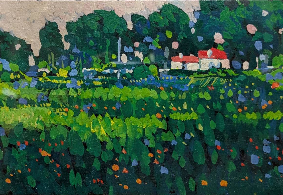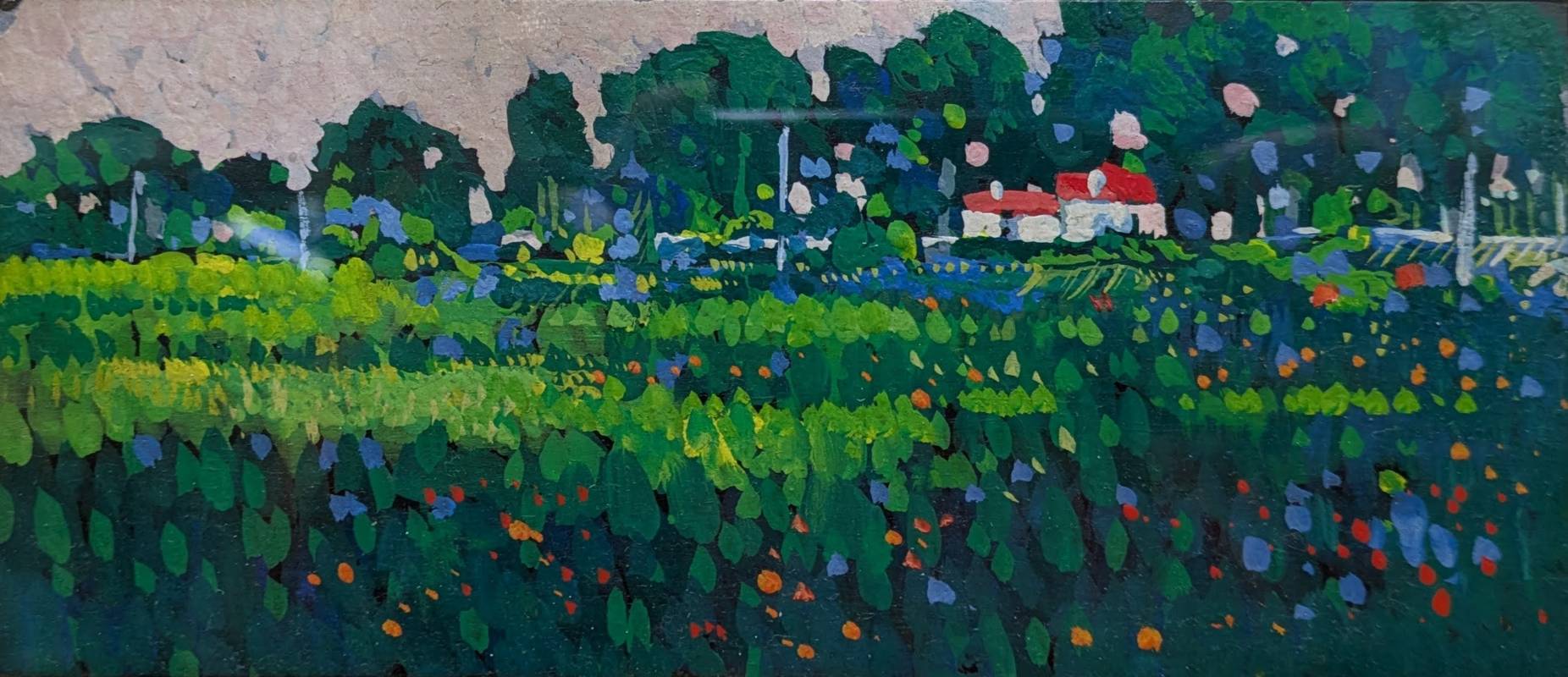 L’opera raffigura un ampio prato punteggiato di fiori, al fondo del quale si scorgono due casette. Il cielo rosato ci suggerisce che la scena è stata ritratta alle prime luci del giorno o sull’imbrunire.