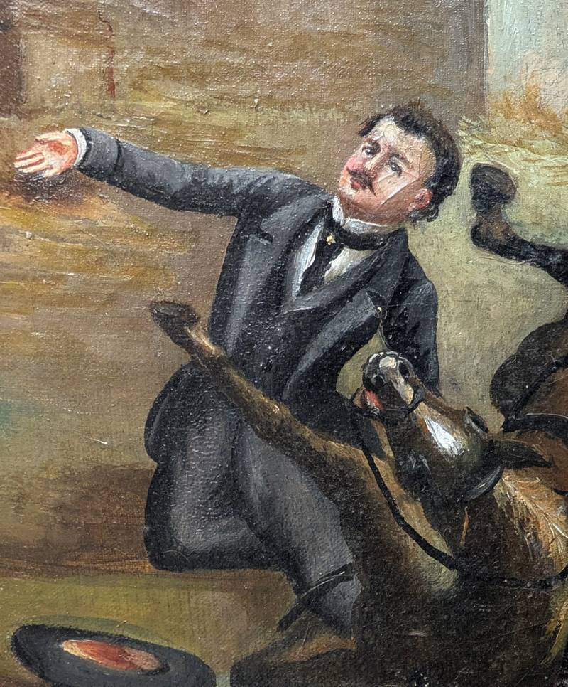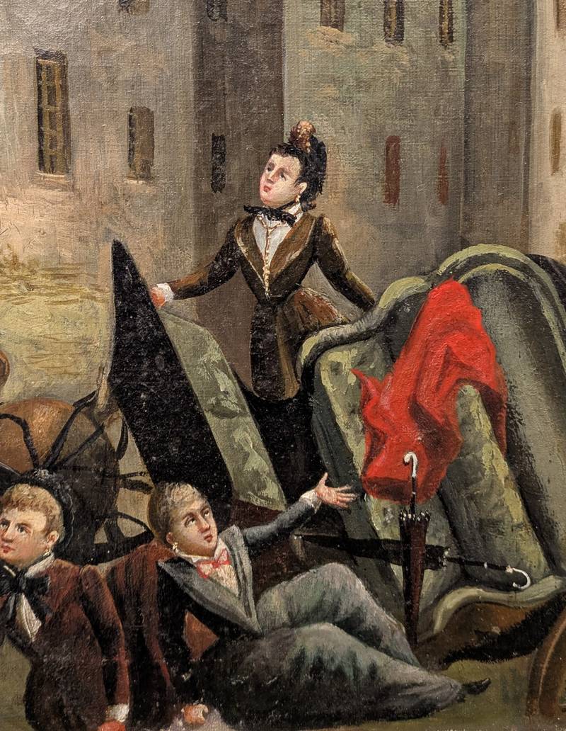 Opera di arte popolare che raffigura un incidente in carrozza in cui sono state coinvolte quattro figure. Scampato il pericolo, i personaggi alzano gli occhi al cielo ed assistono all’apparizione di un santo.