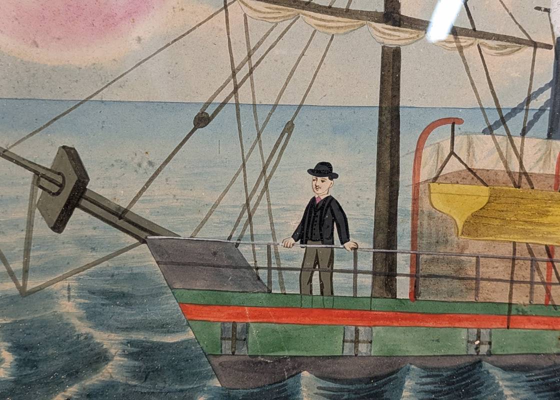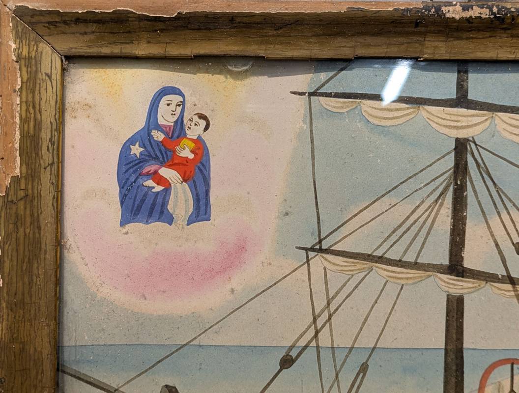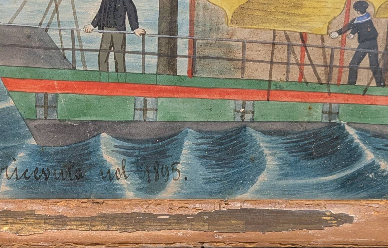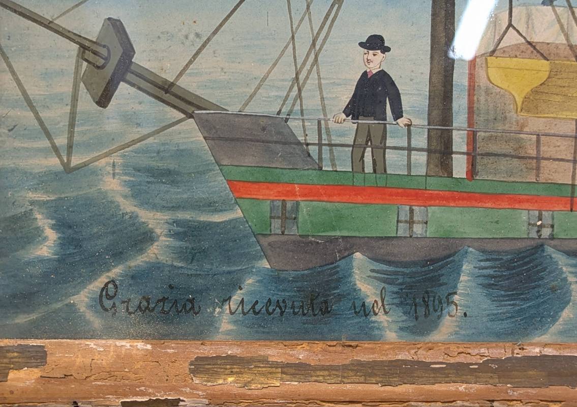 Ex voto dipinto a tempera su tavola, datato 1895. Opera di carattere popolare realizzata da un fedele in segno di riconoscenza per una grazia ricevuta. La tavola raffigura una imbarcazione a vapore con alcuni marinai a bordo, mentre nell’angolo in alto a sinistra appare la Madonna con il Bambino.