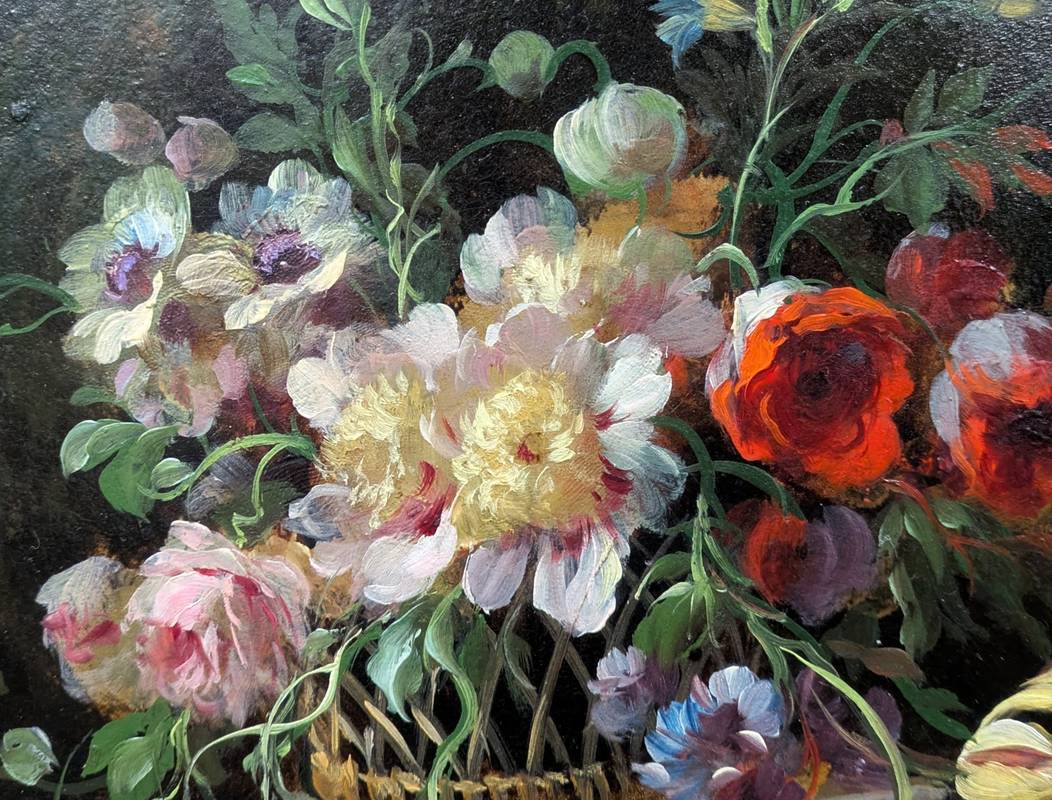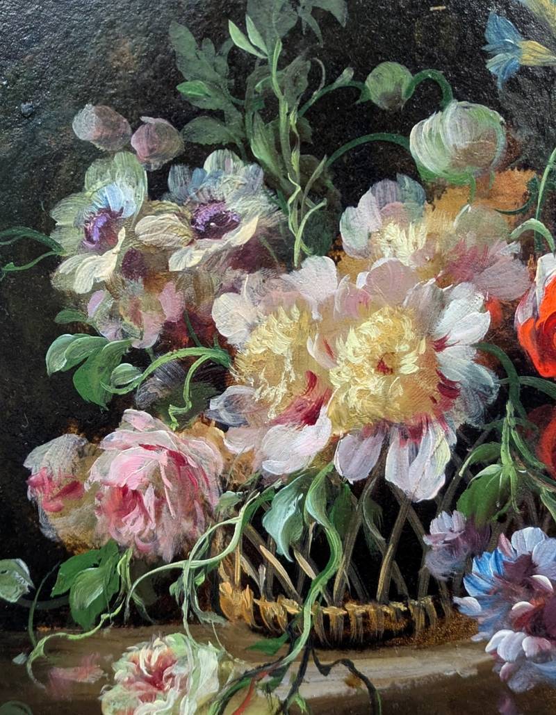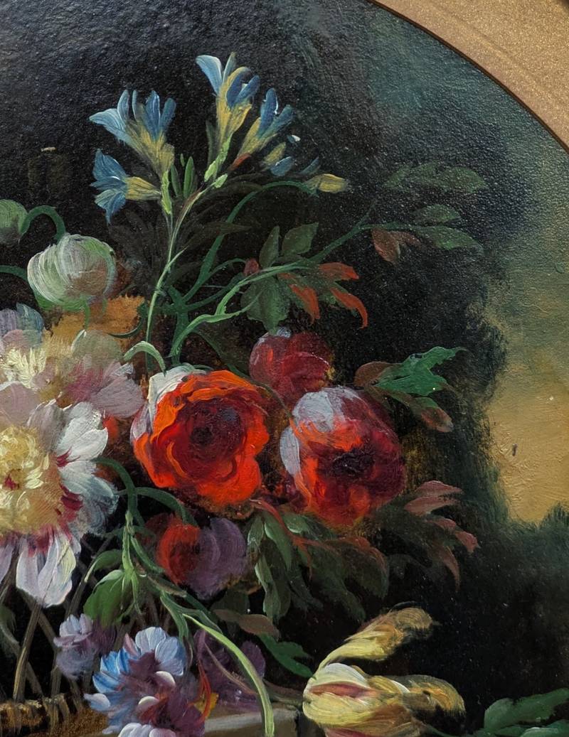 L’opera ritrae una natura morta floreale ambientata all’esterno, in stile settecentesco.