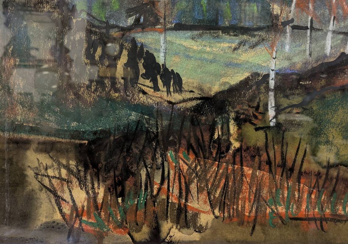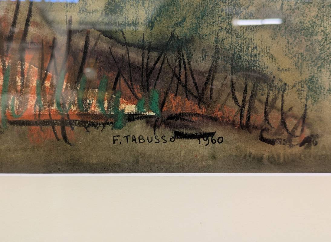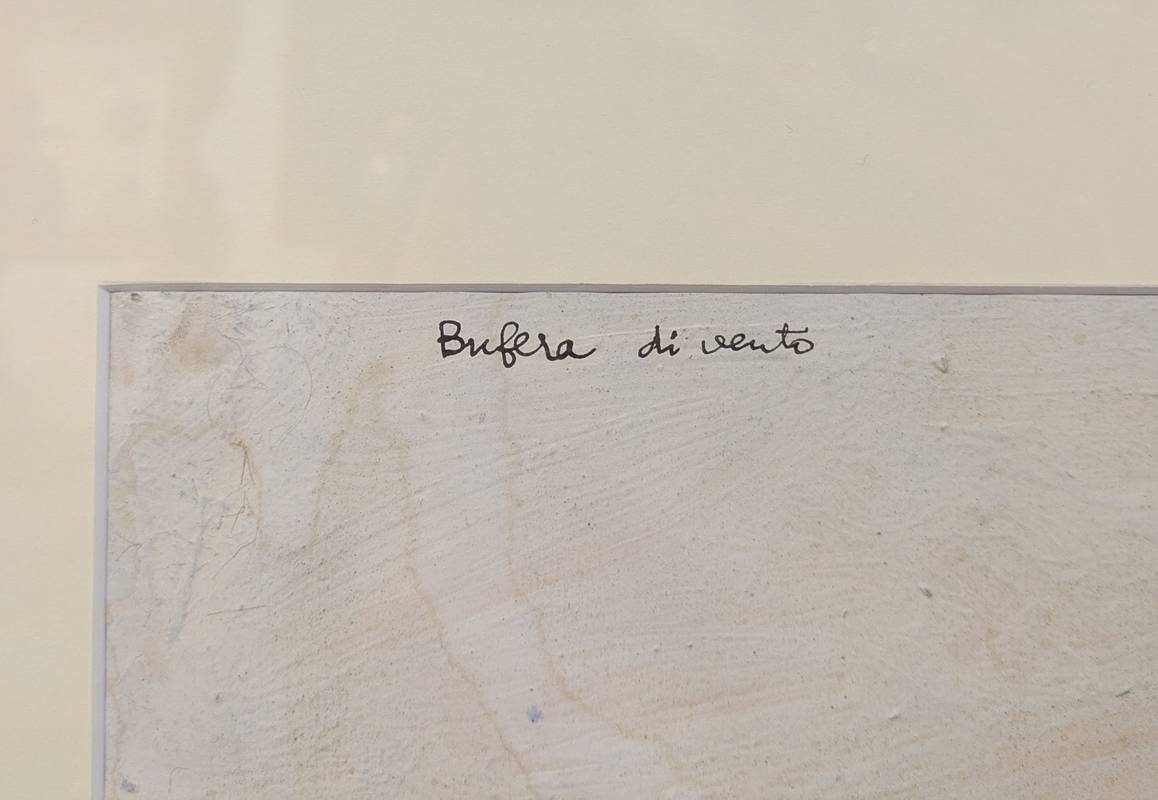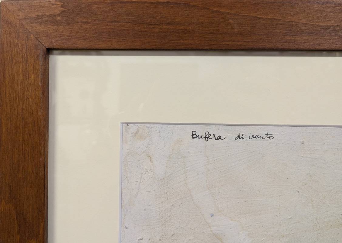 Dipinto a tecnica mista su carta firmato in basso a destra Francesco Tabusso (Sesto San Giovanni, 27 giugno 1930 – Torino, 29 gennaio 2012), pittore piemontese. Datato 1960 e intitolato in alto a sinistra Bufera di vento.