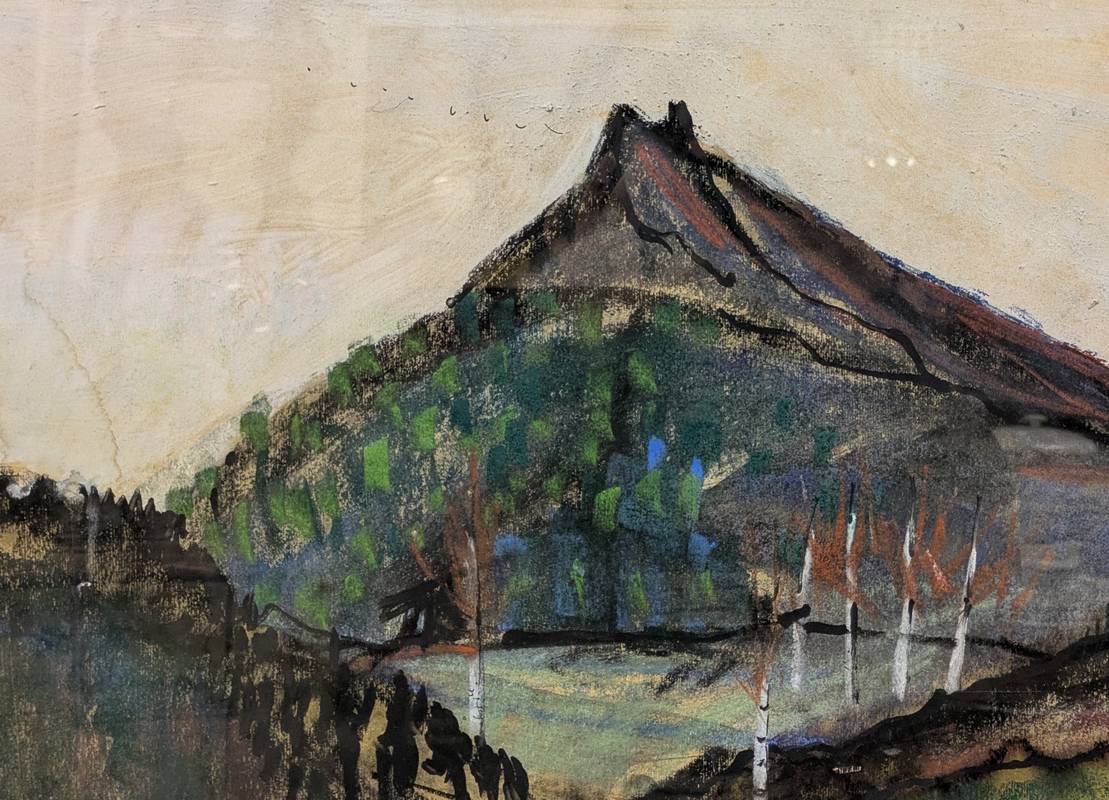 L’opera rappresenta un paesaggio collinare con una montagna al centro (forse un vulcano).