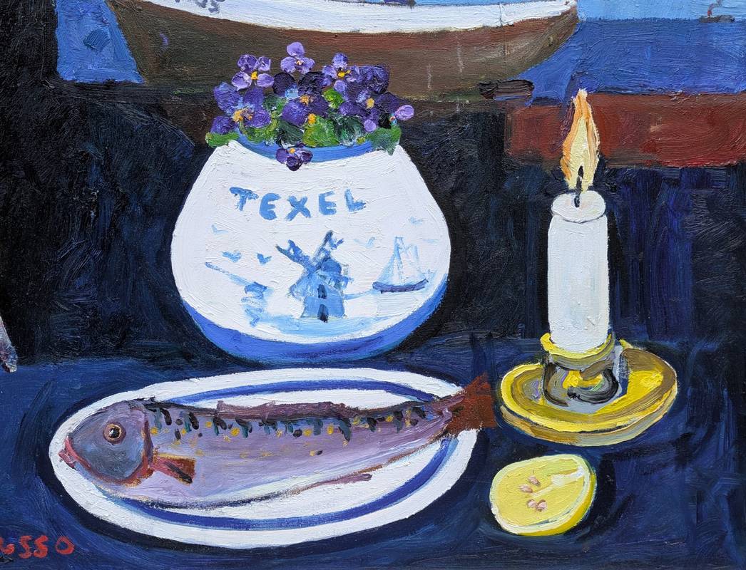 L’opera rappresenta una figura femminile seduta a una tavola imbandita con piatti di pesce. Dalla finestra alle sue spalle si ha una veduta dell’esterno, da cui si scorge un’imbarcazione con bandiera olandese.