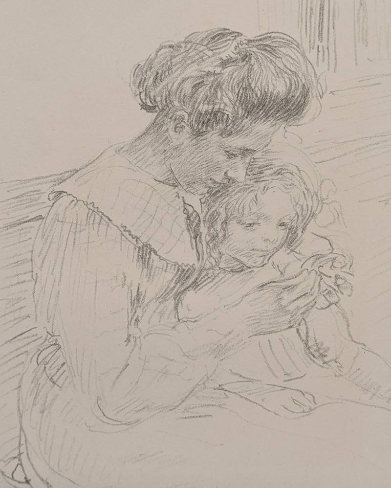 L’opera rappresenta una figura femminile che tiene tra le braccia una bambina, mentre le mostra un piccolo oggetto (da qui il titolo francese La leçon), in un’immagine di grande tenerezza. Opera pubblicata a Parigi ne La gazzette des Beaux-Arts, come indicato in basso a sinistra.