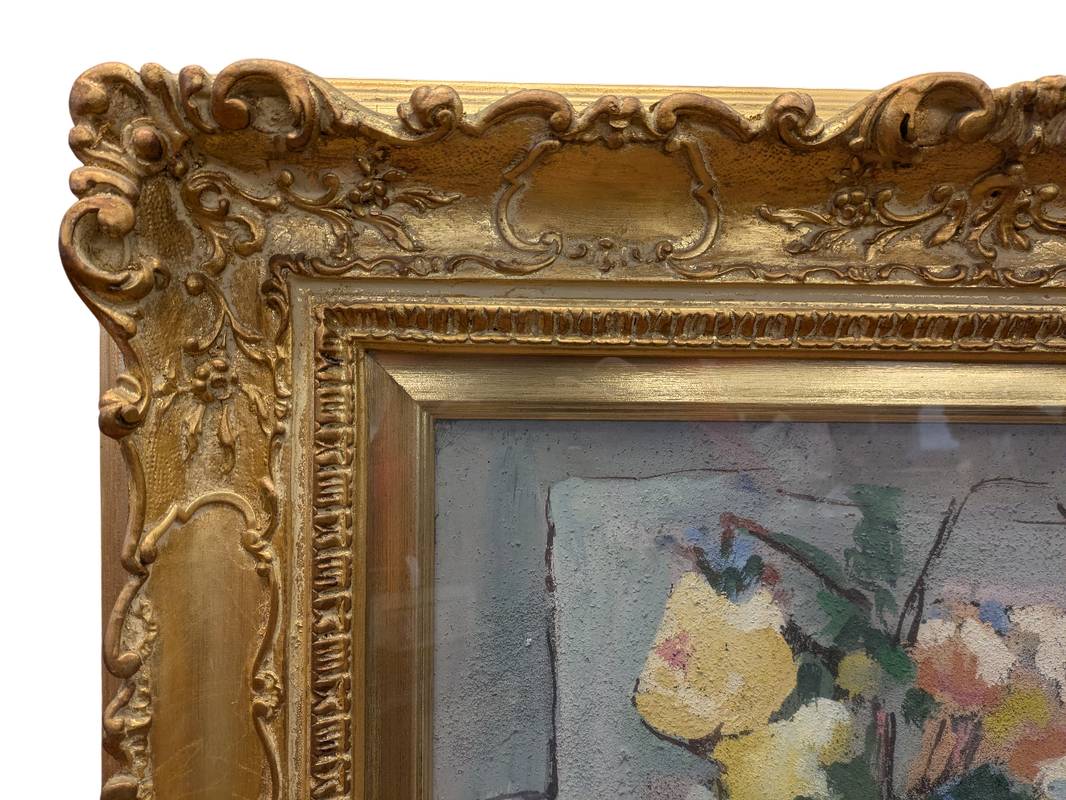 L’opera ritrae una natura morta con un vaso di fiori, probabilmente rose.