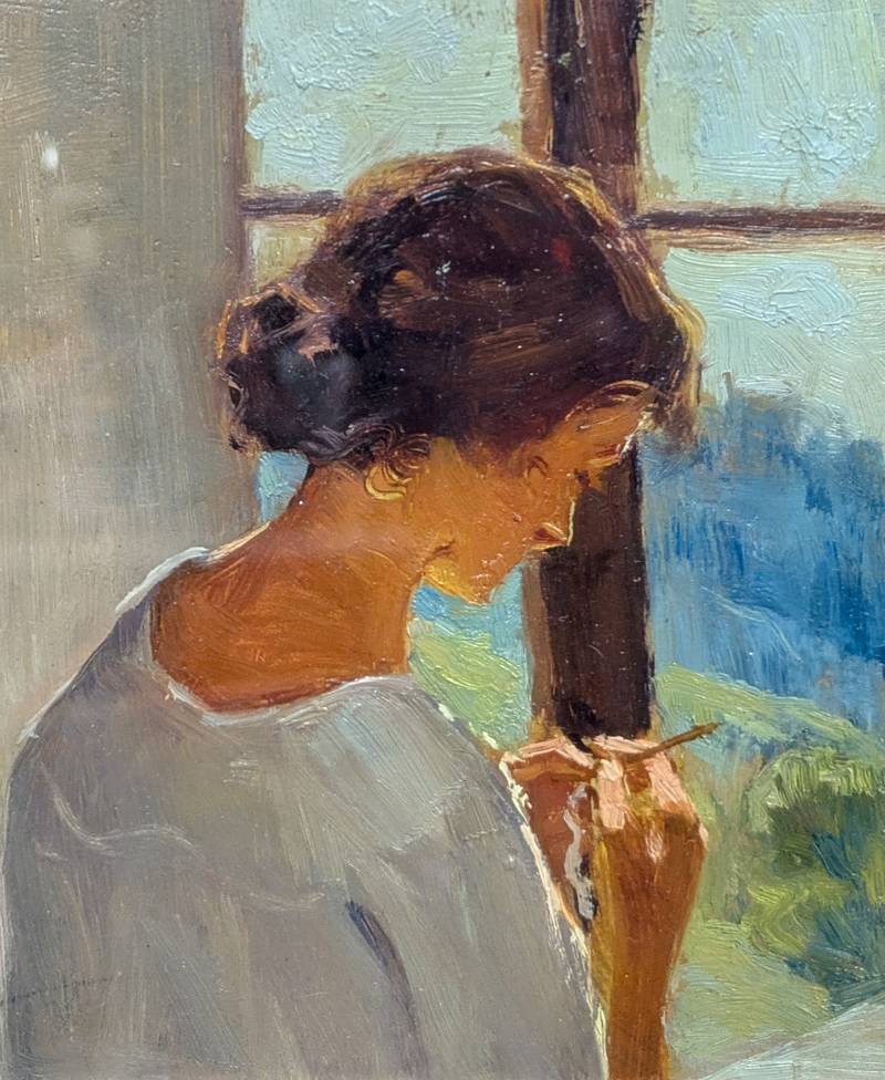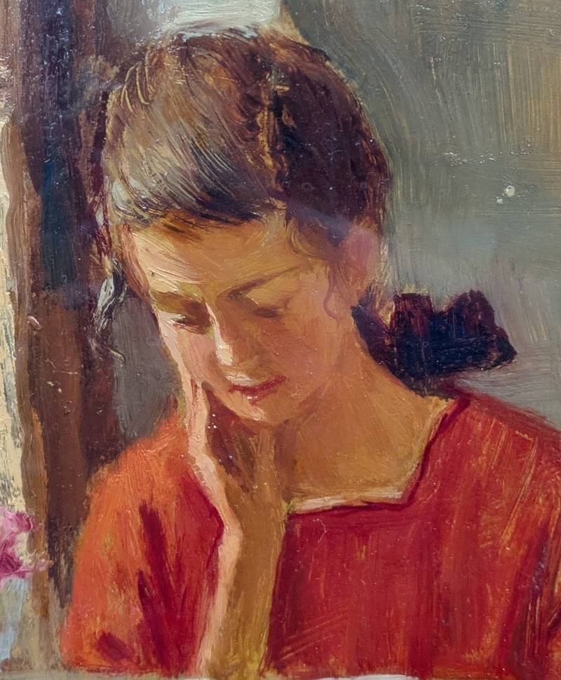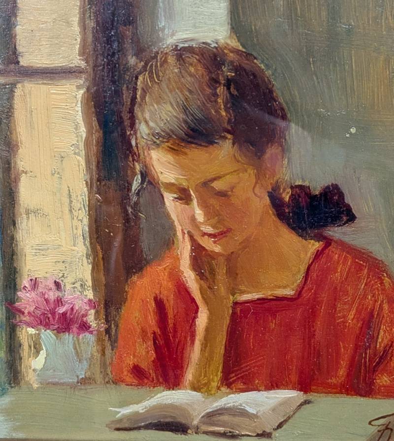 L’opera ritrae una scena domestica con due figure femminili: la fanciulla di spalle lavora a maglia, mentre quella a destra è immersa nella lettura di un libro.