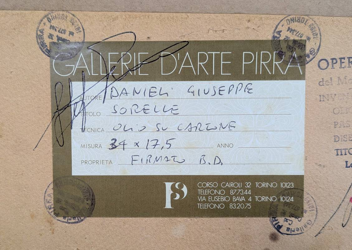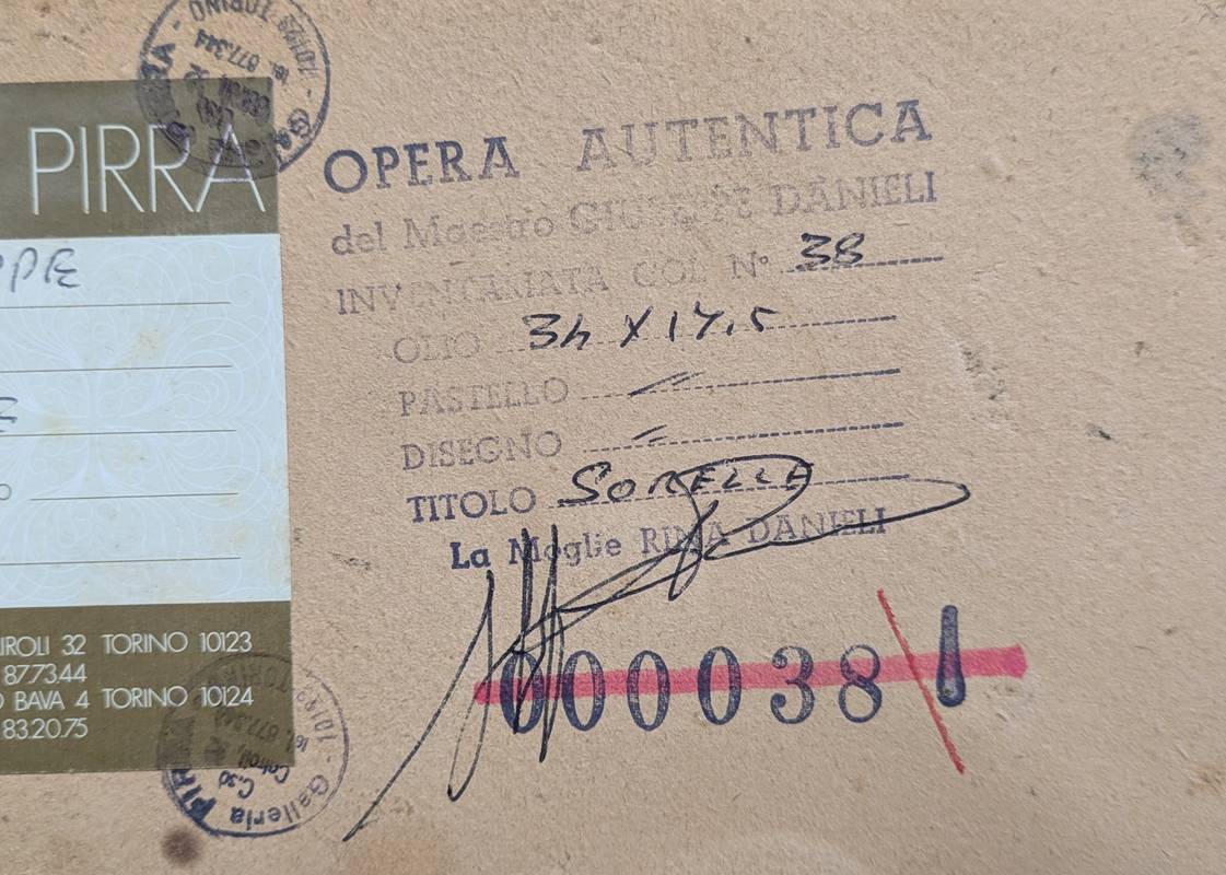 Al retro vi è l’etichetta della galleria d’arte Pirra di Torino e il timbro per autentica della moglie Rina Danieli.