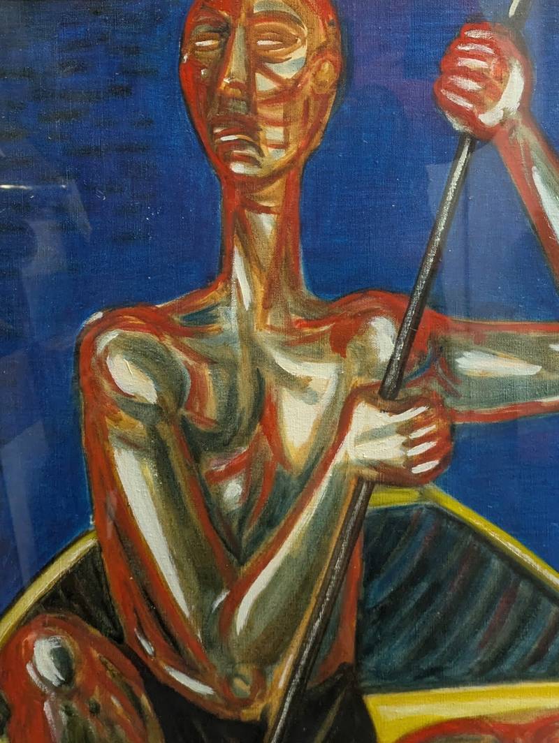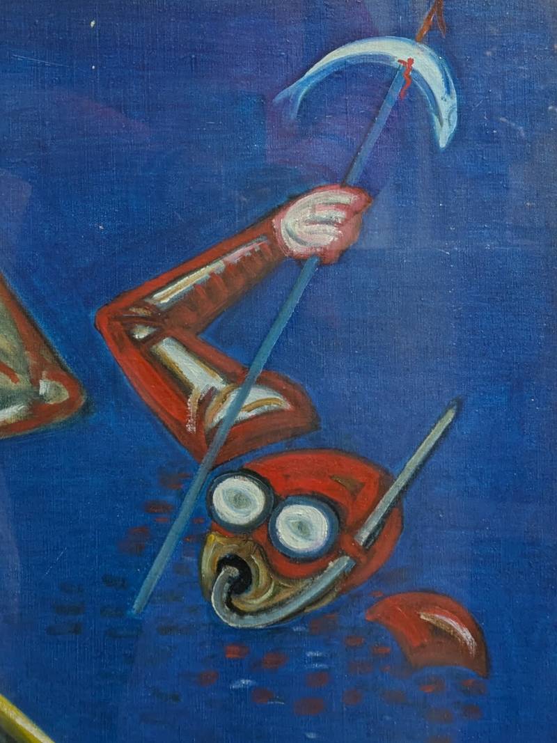 L’opera raffigura due pescatori a bordo di una piccola barca a remi, mentre sulla sinistra si vede un sub che affiora dall’acqua. Il dipinto si caratterizza per una palette di colori vivaci, oltre che per lo stile identificativo dell’artista siciliano.