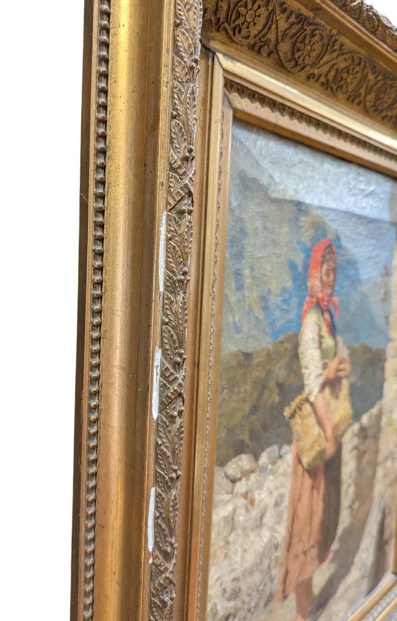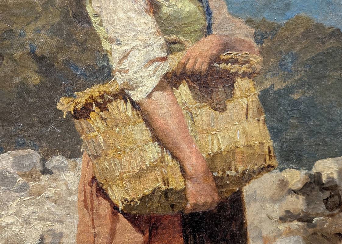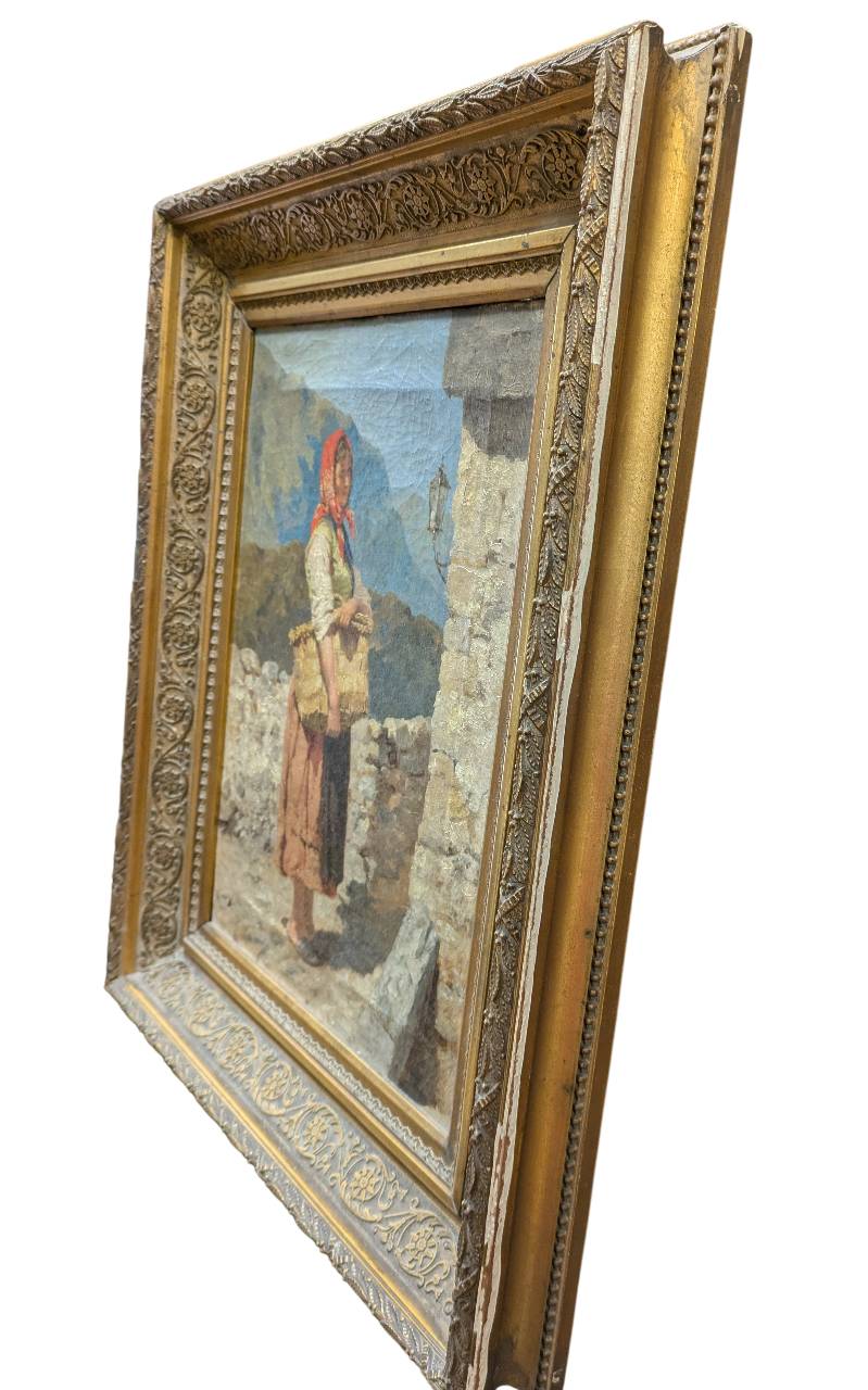 L’opera ritrae una contadina di profilo con una borsa di vimini tra le mani, all’esterno di un casolare in pietra.