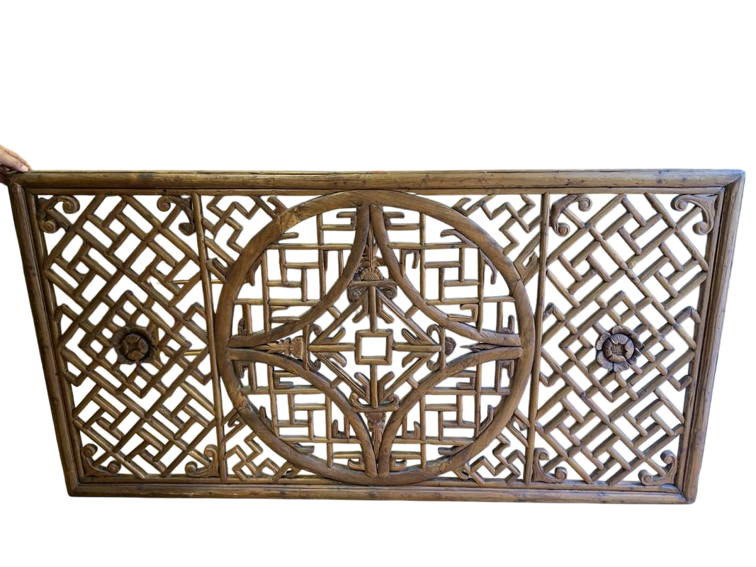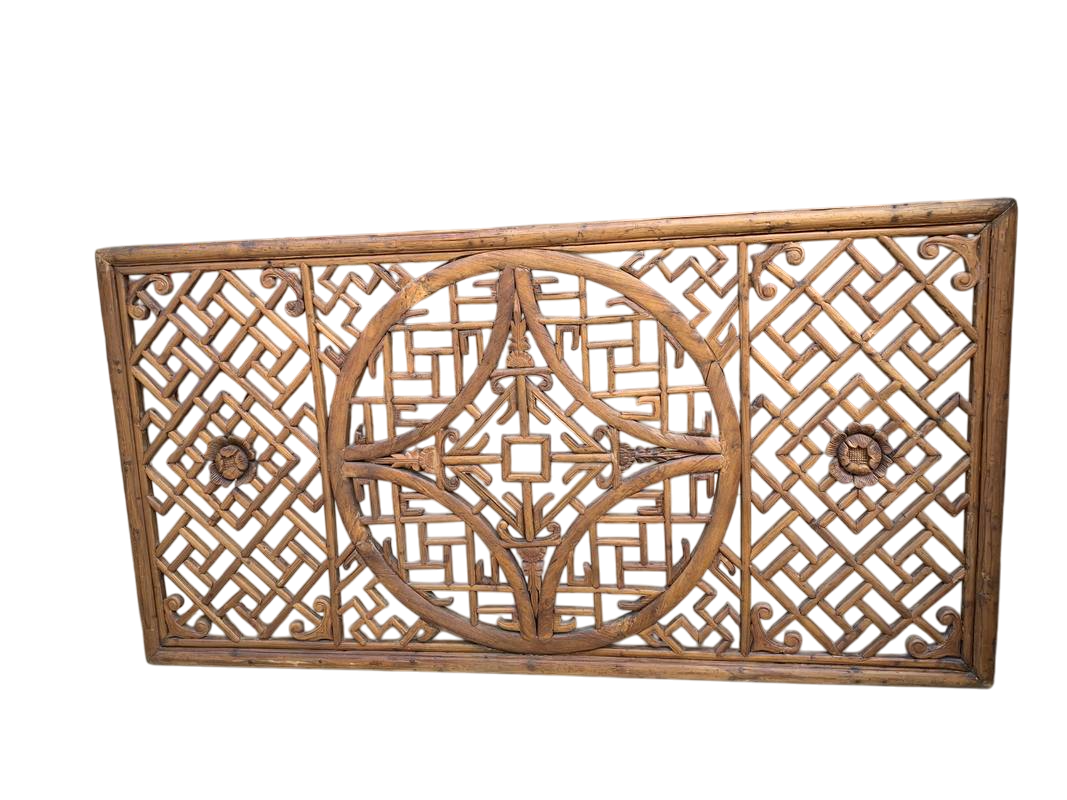 Pannello in legno di olmo cinese Scolpito con maestria, questo pannello è una composizione sorprendente di motivi simbolici e dettagli intricati
